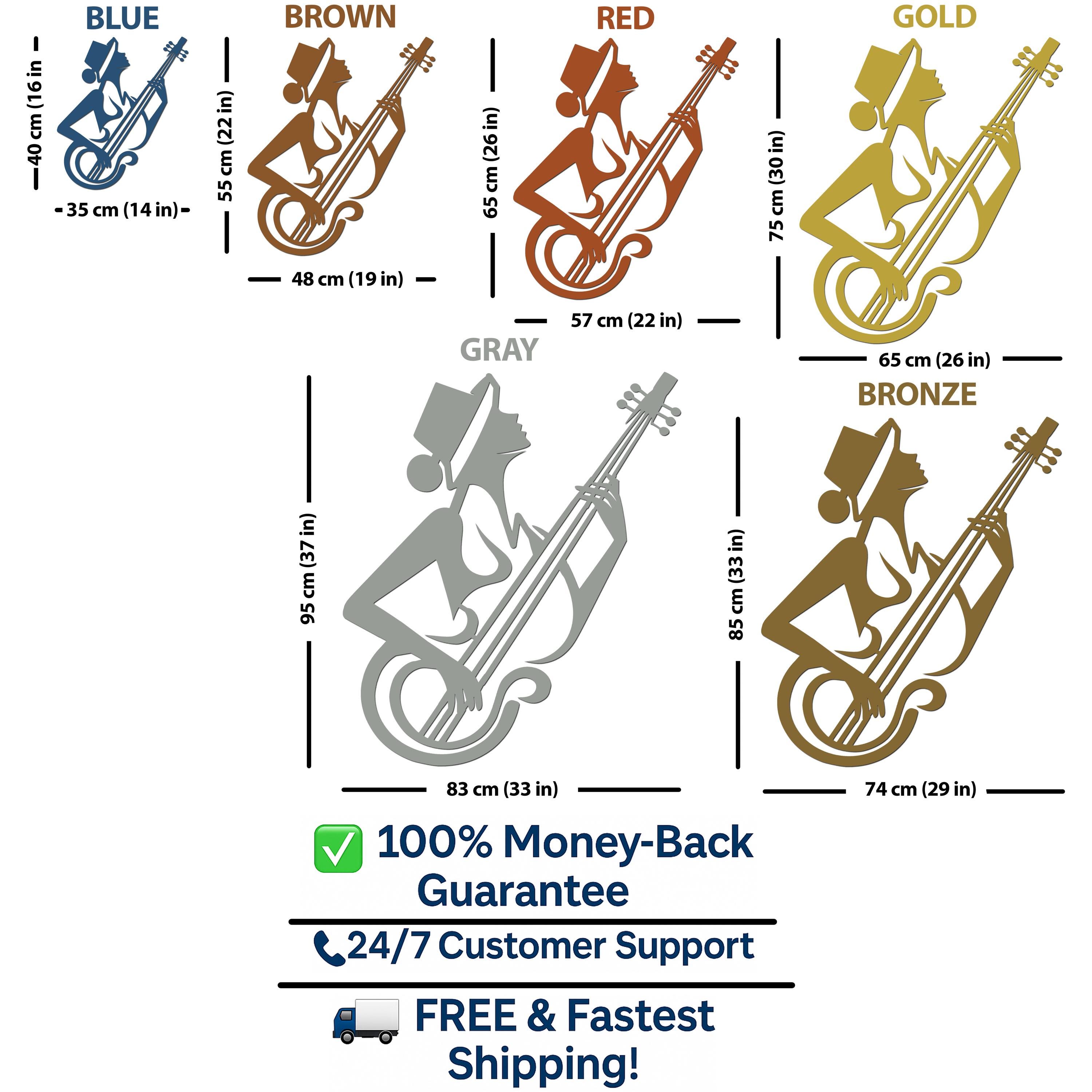Elevate your home decor with this elegant metal wall art featuring a female bassist. Perfect for music enthusiasts and those looking to add a modern and artistic flair to their space.