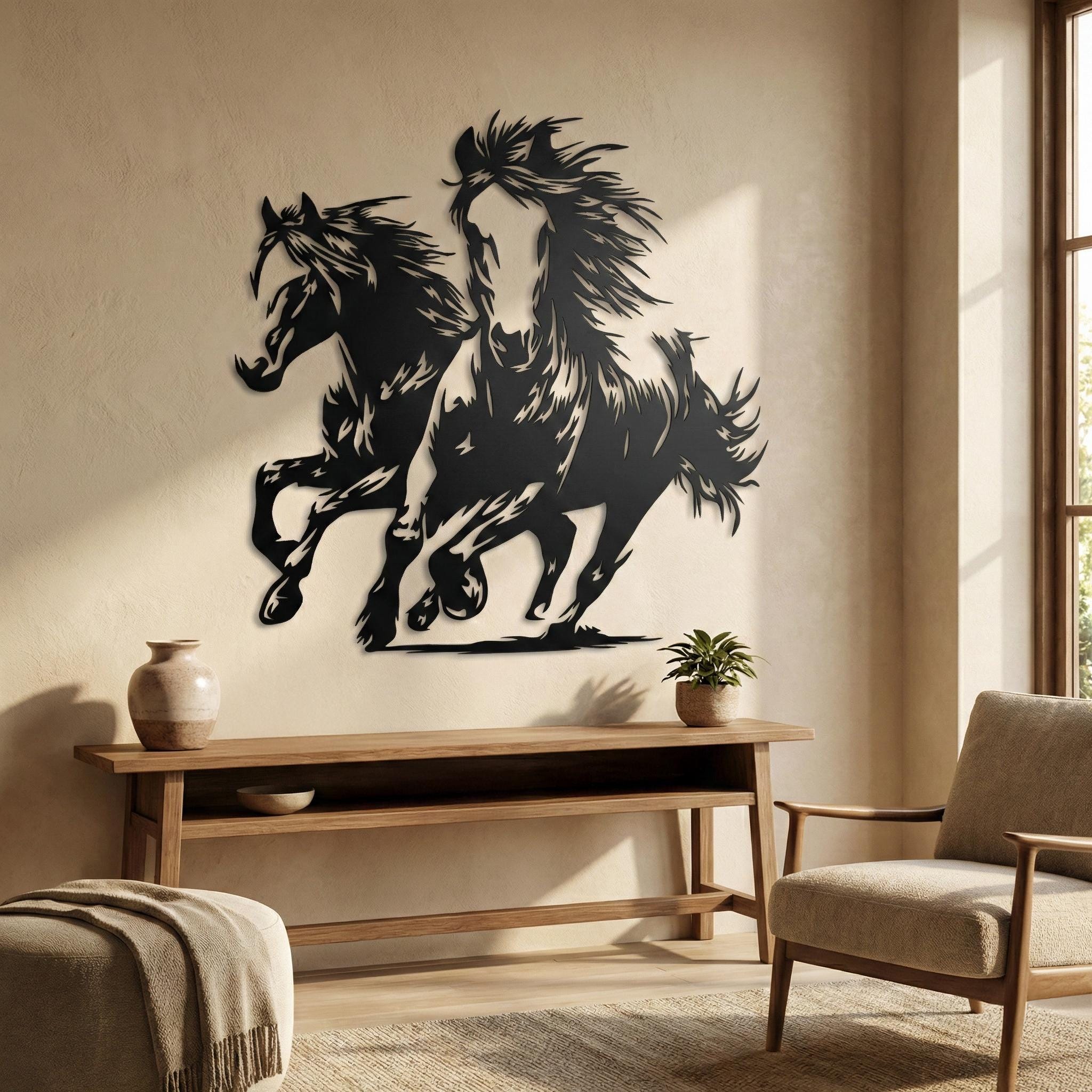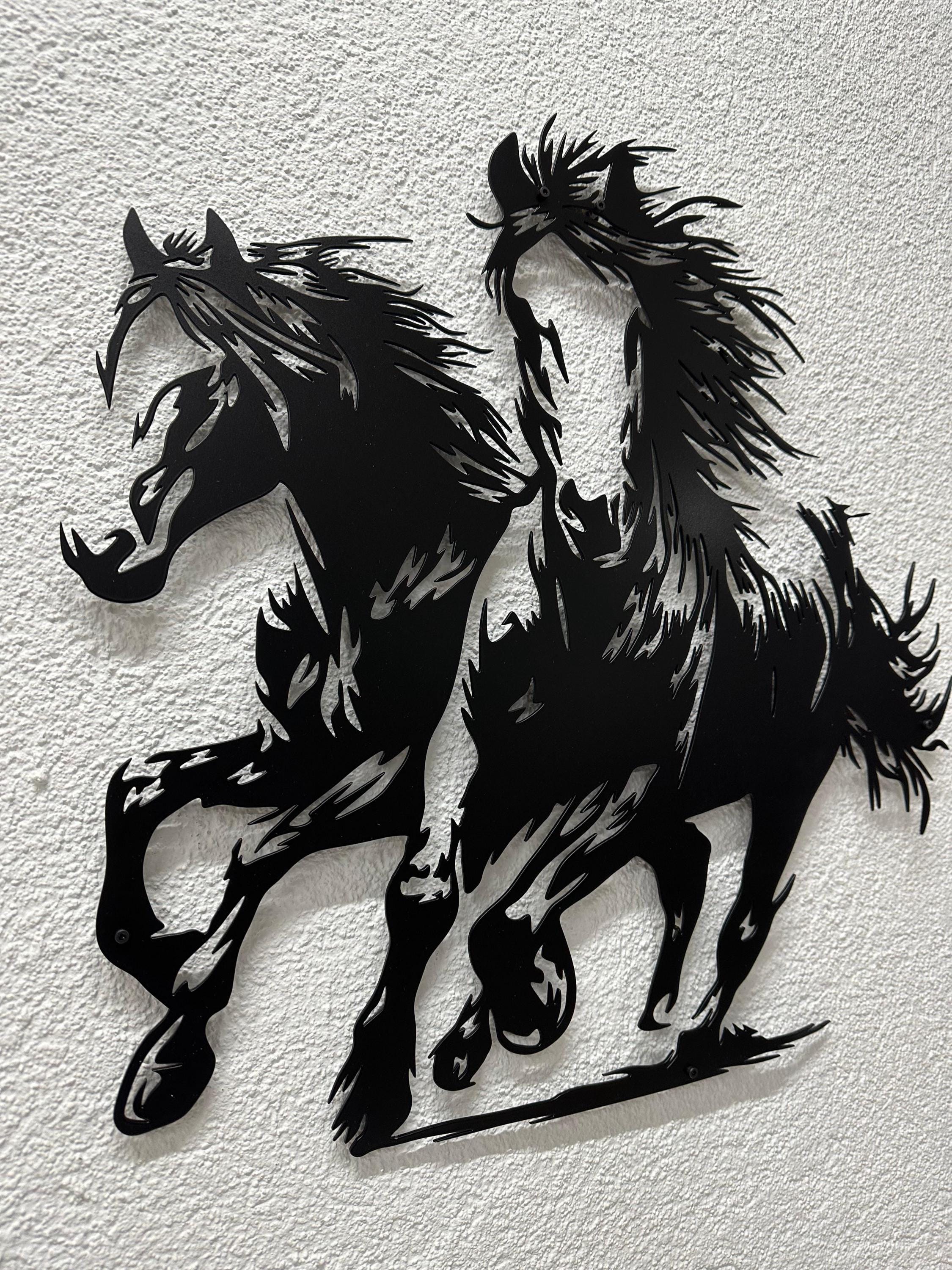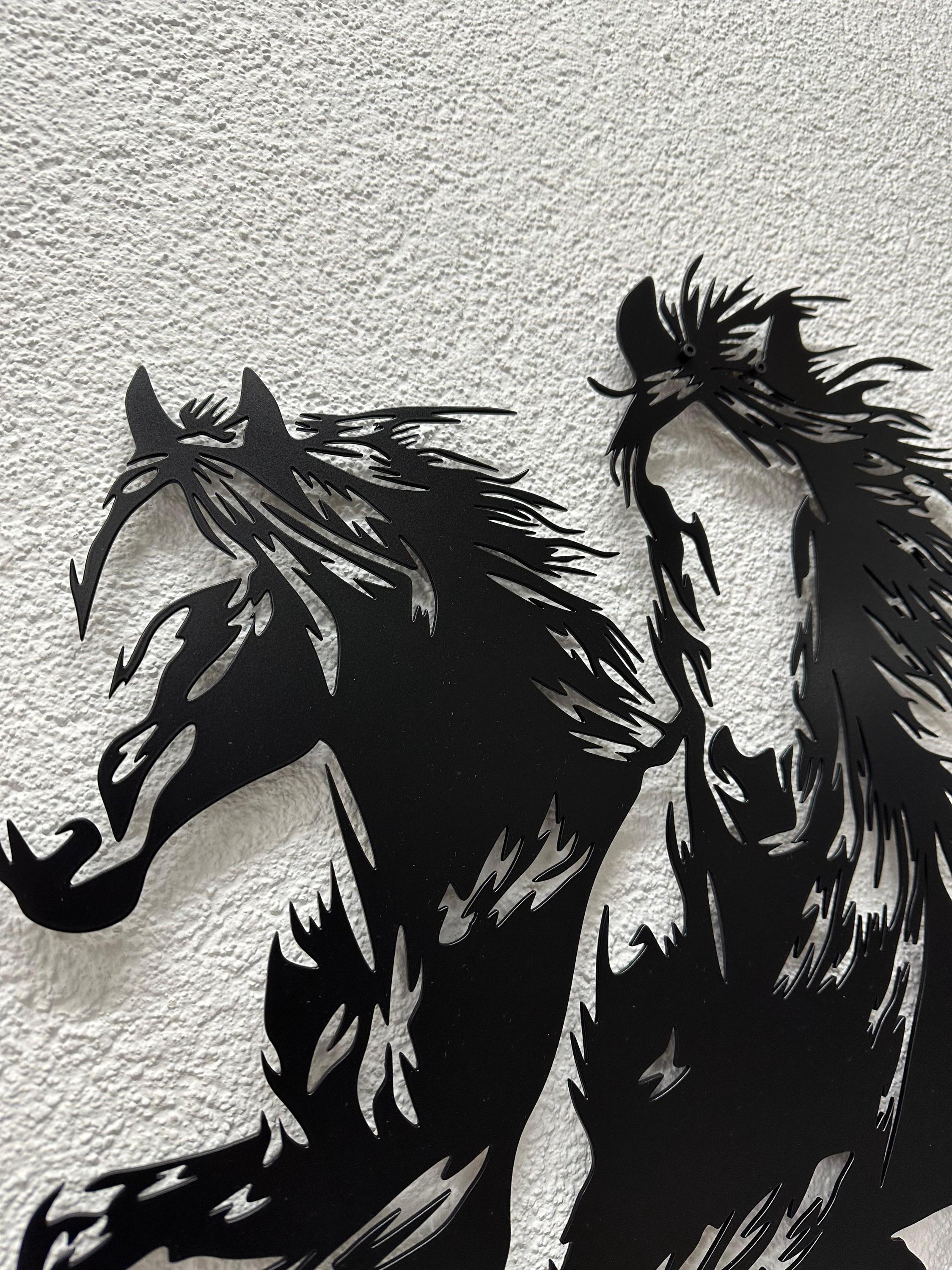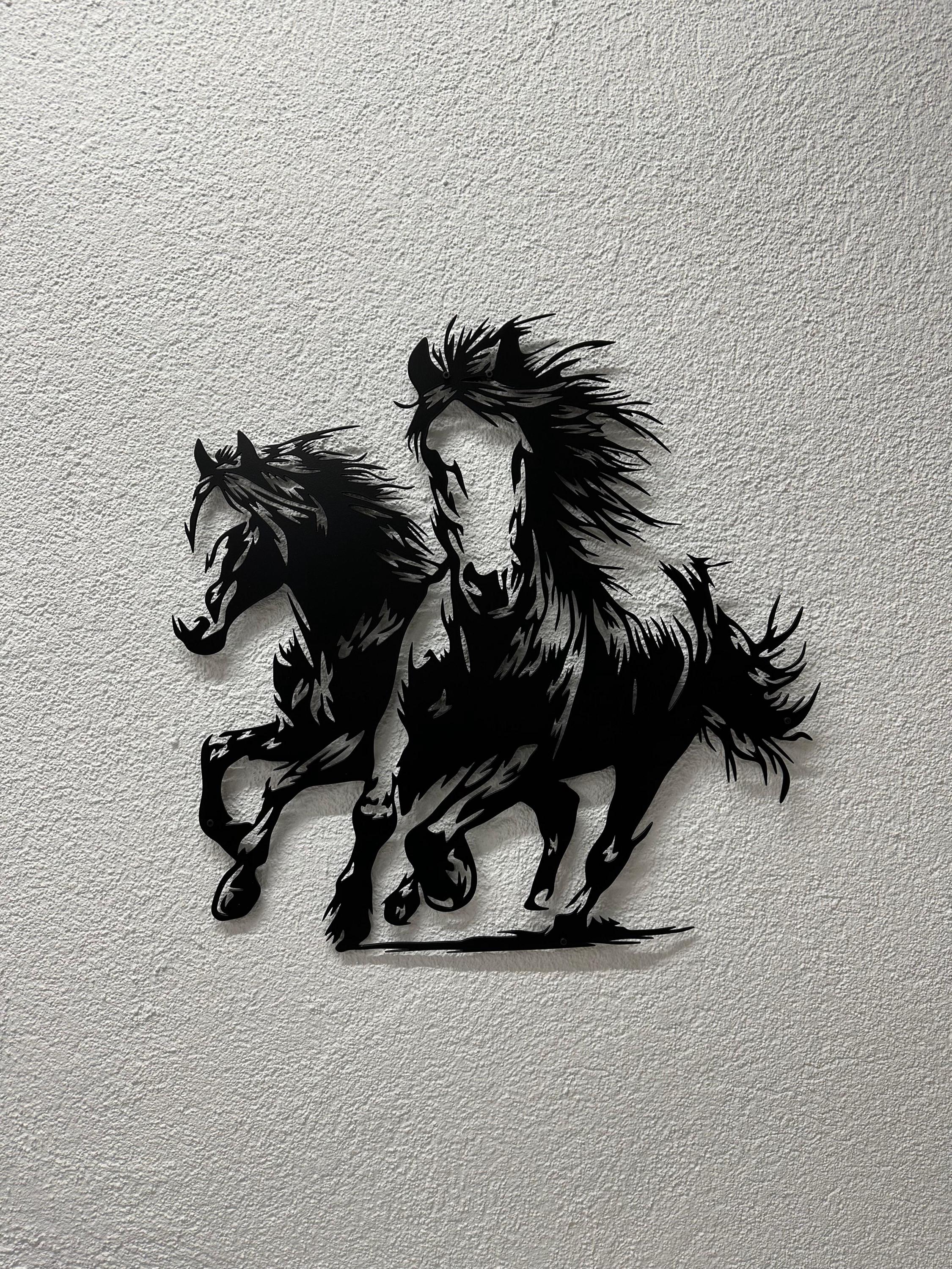 Experience the untamed beauty of wild horses with this dynamic metal wall art piece, depicting two horses in full gallop. Crafted from high-quality mild steel, this stunning decor captures the essence of freedom and movement, perfect for adding a touch of the wild to your home.