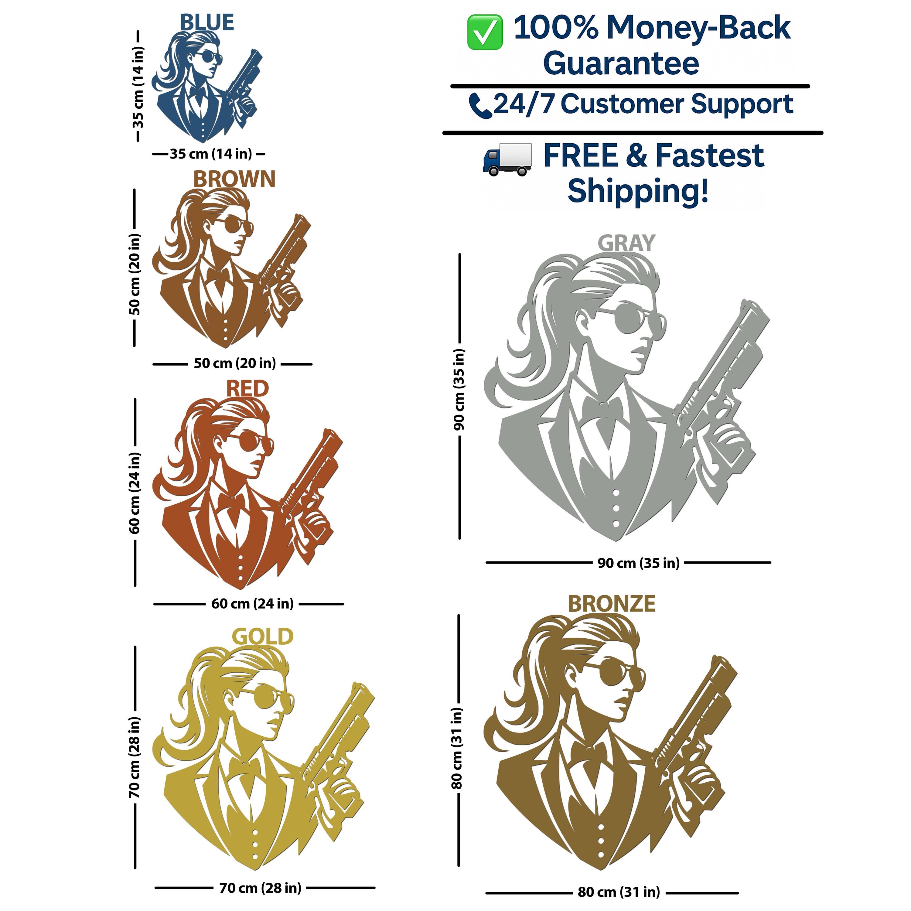Elegant Female Assassin Metal Wall Art | Woman with Gun in Suit | Modern Home Decor | Stylish Wall Hanging | Gift for Her