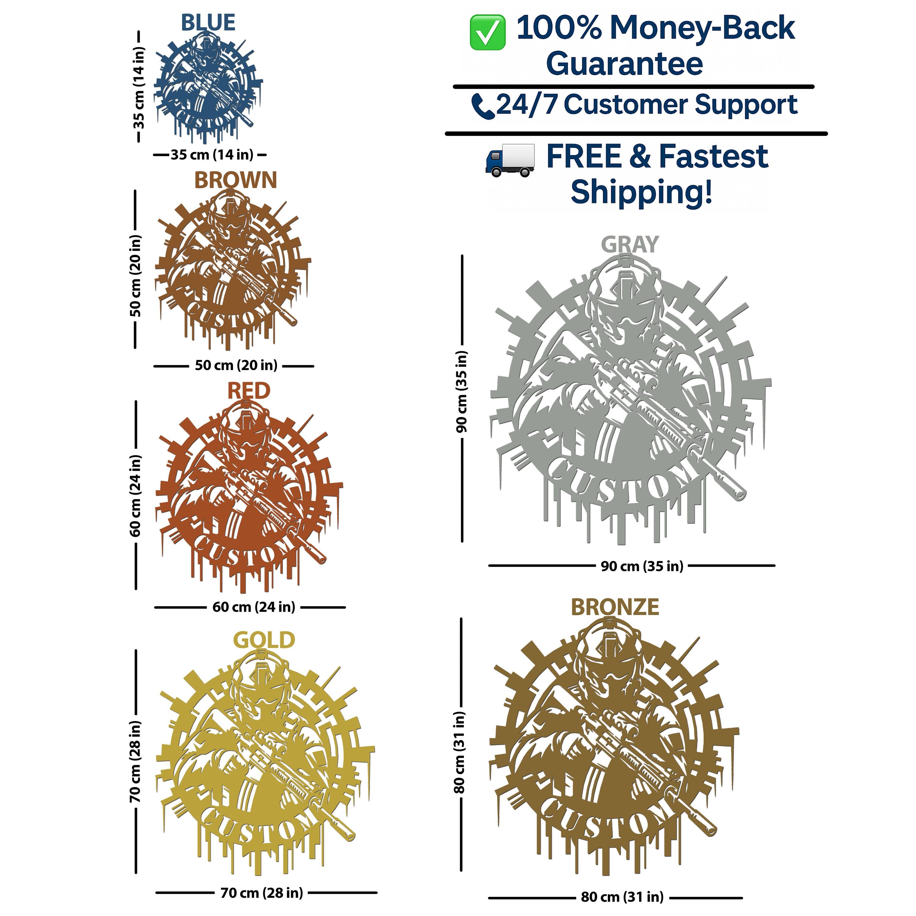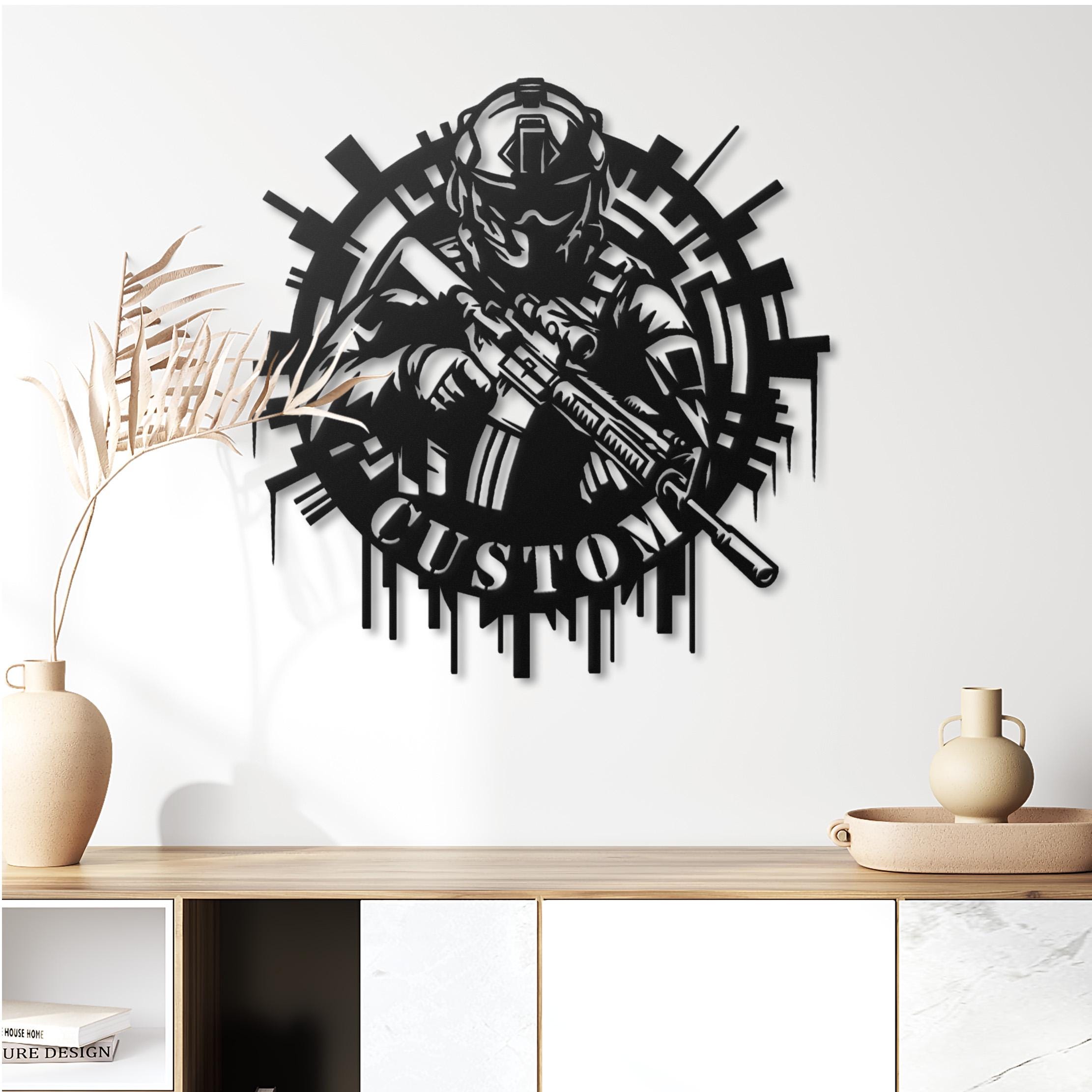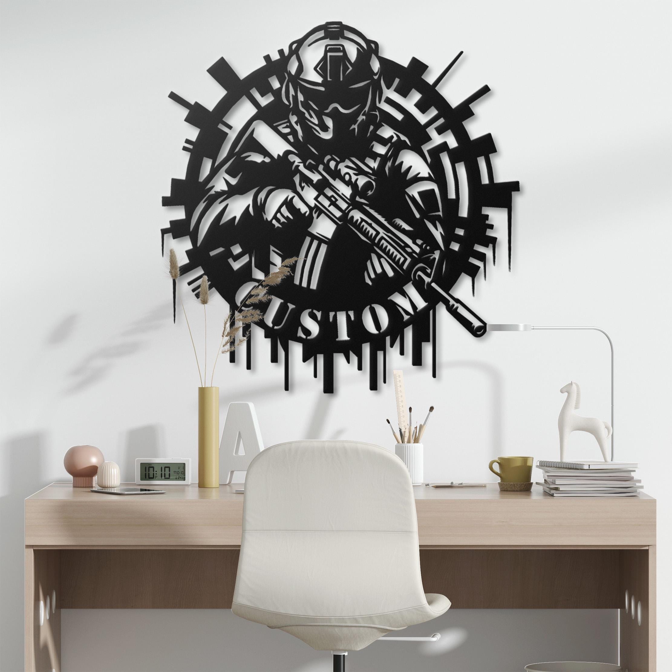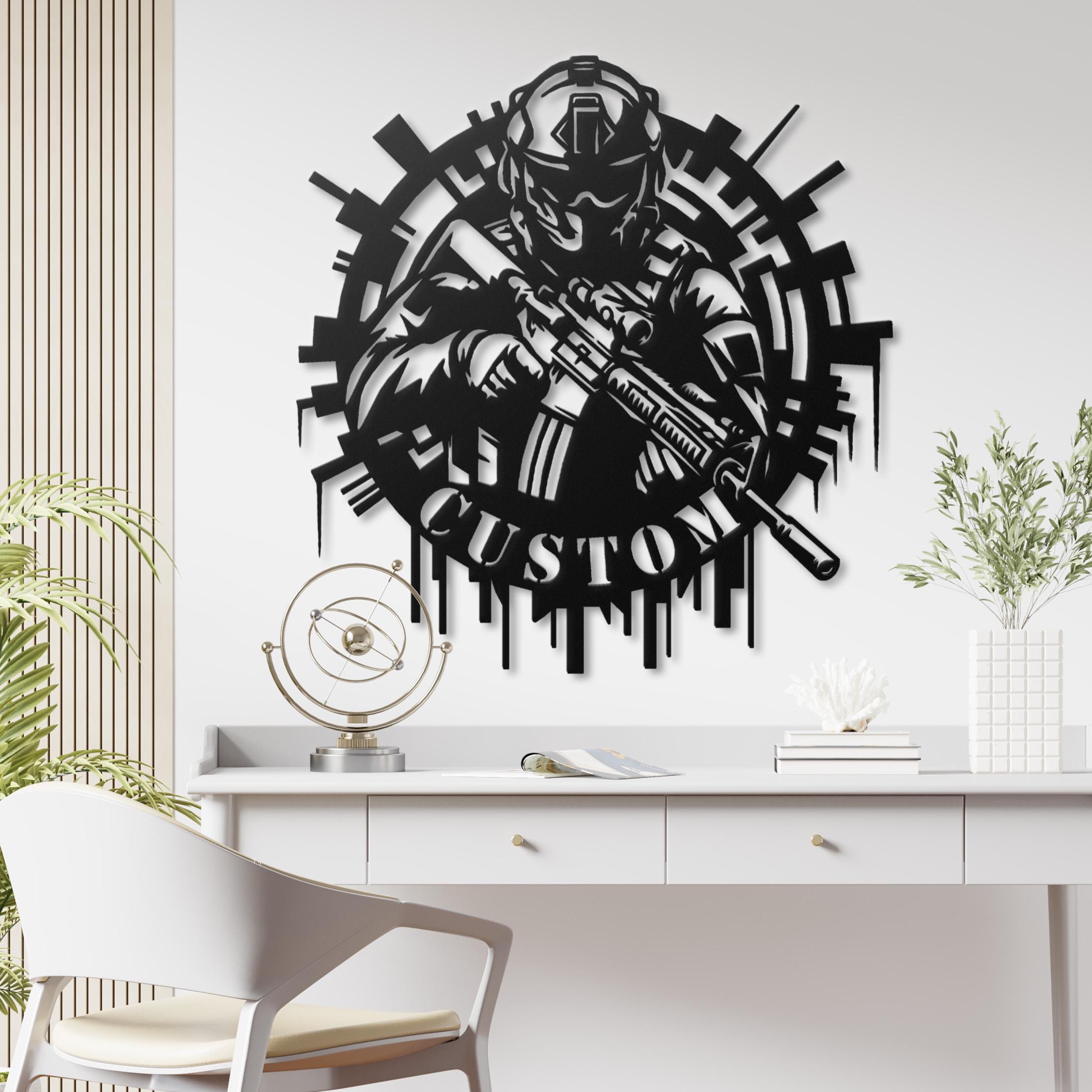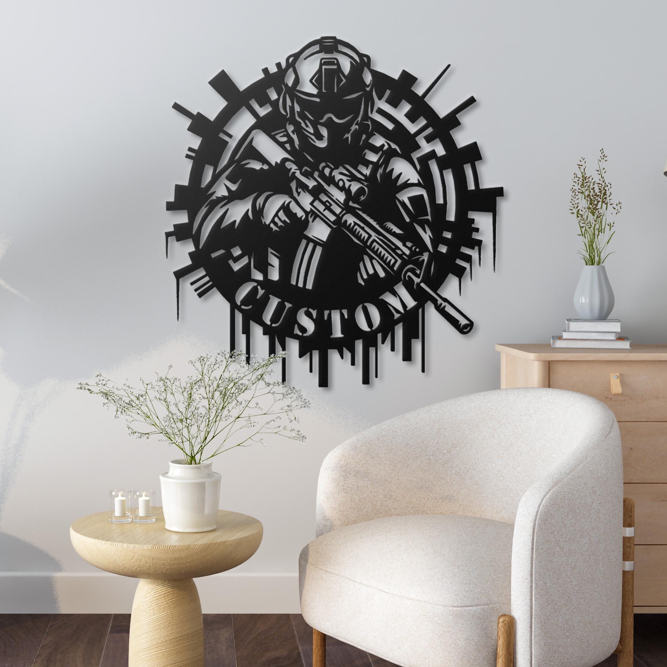 Add a touch of tactical elegance to your home with this striking metal wall art featuring a custom soldier design. Perfect for military enthusiasts and those looking to add a unique and bold statement piece to their decor.