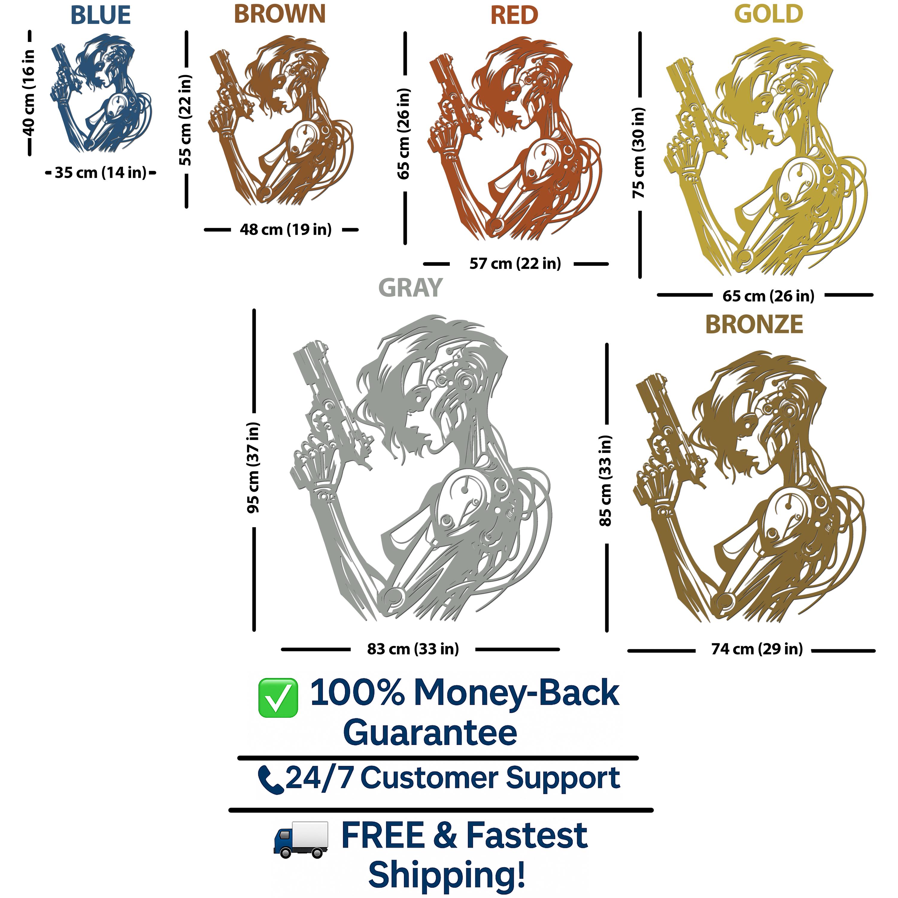 Female Cyborg Metal Wall Art - Futuristic Female Assassin with Gun - Sci-Fi Industrial Decor