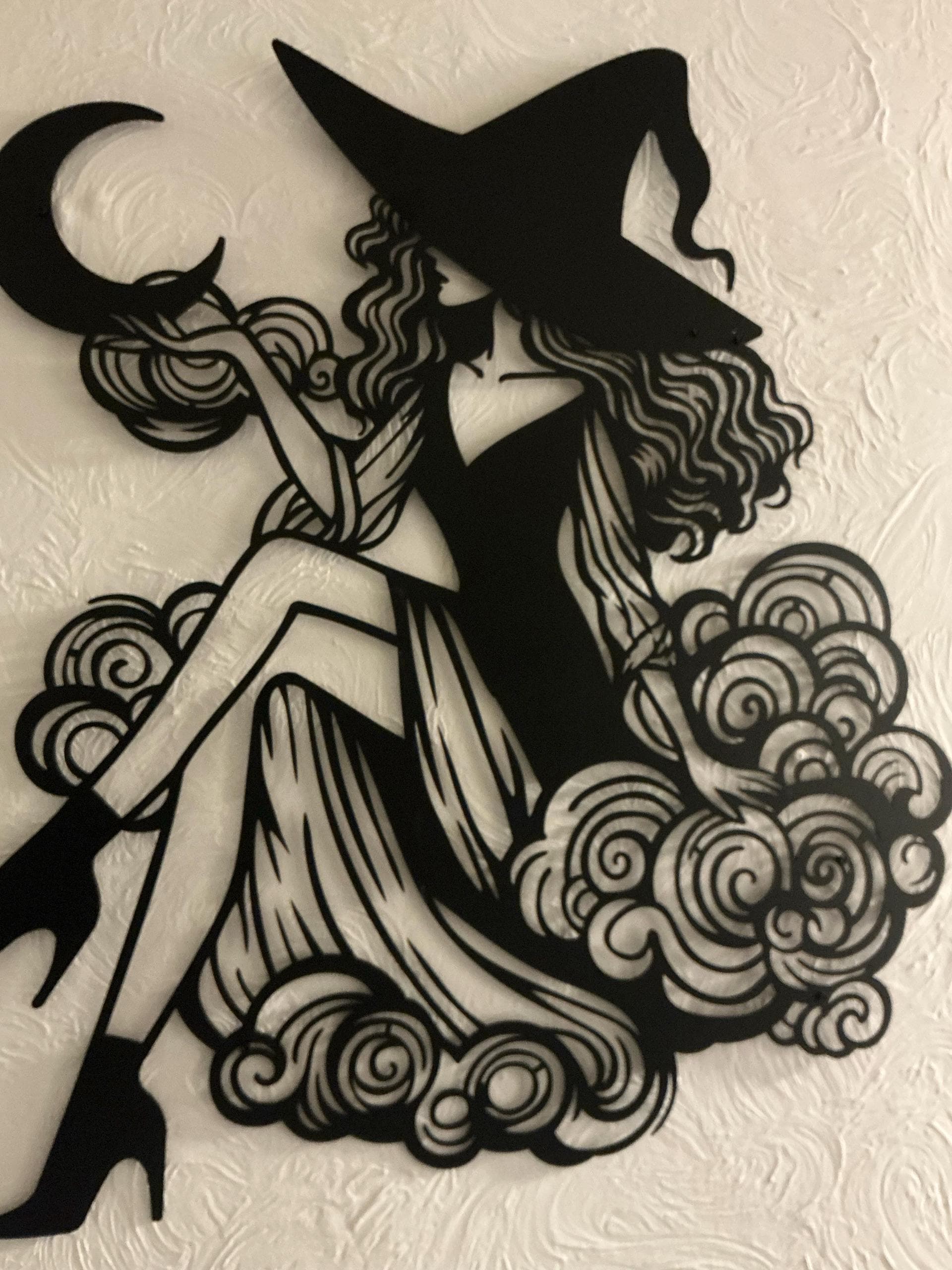 ✨ Elevate your space with this enchanting metal wall art featuring a mystical witch sitting gracefully on a cloud, holding a crescent moon. Perfect for adding a touch of gothic charm and celestial vibes to any room, this stunning silhouette art piece is a must-have for witchy décor enthusiasts. 🖤 Crafted with precision, it effortlessly blends style with a hint of magic, making it an eye-catching addition to your home. Comes with pre-installed hanging hardware for easy display. ✨