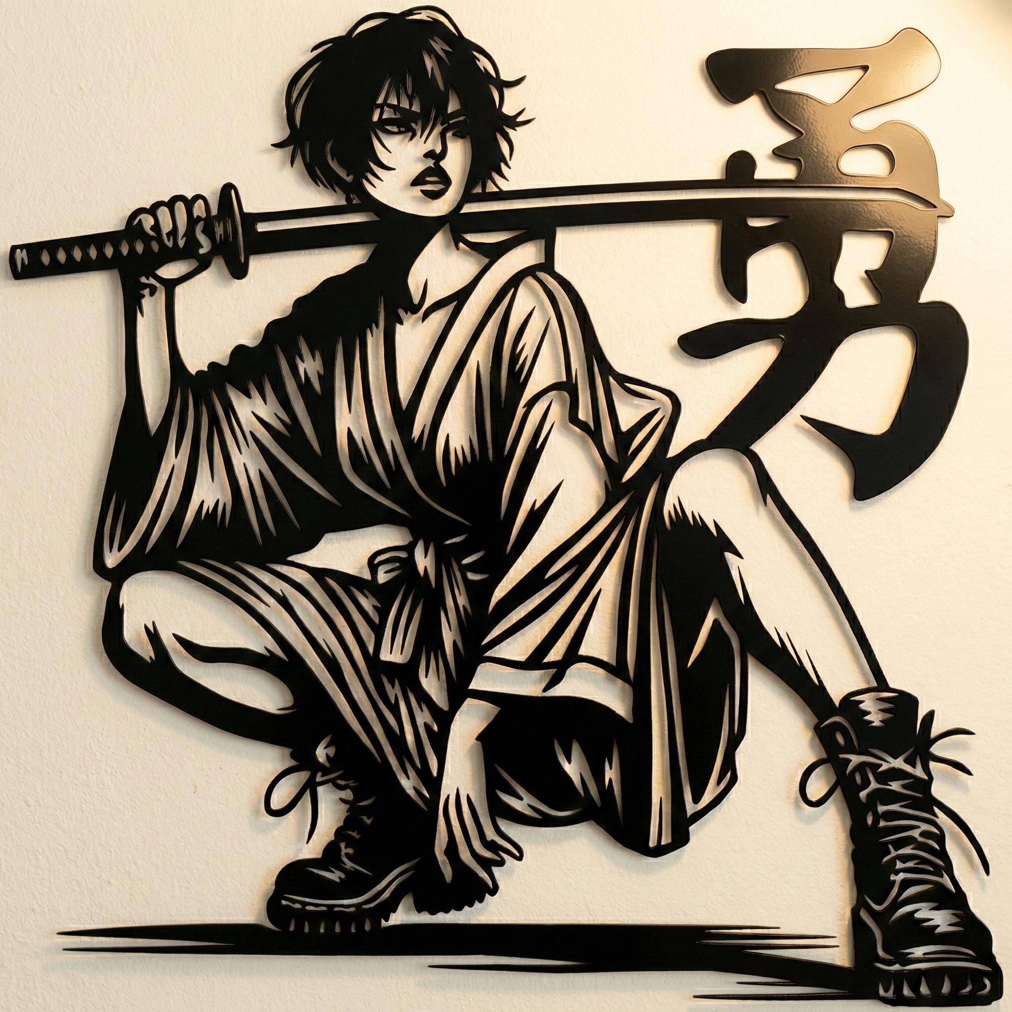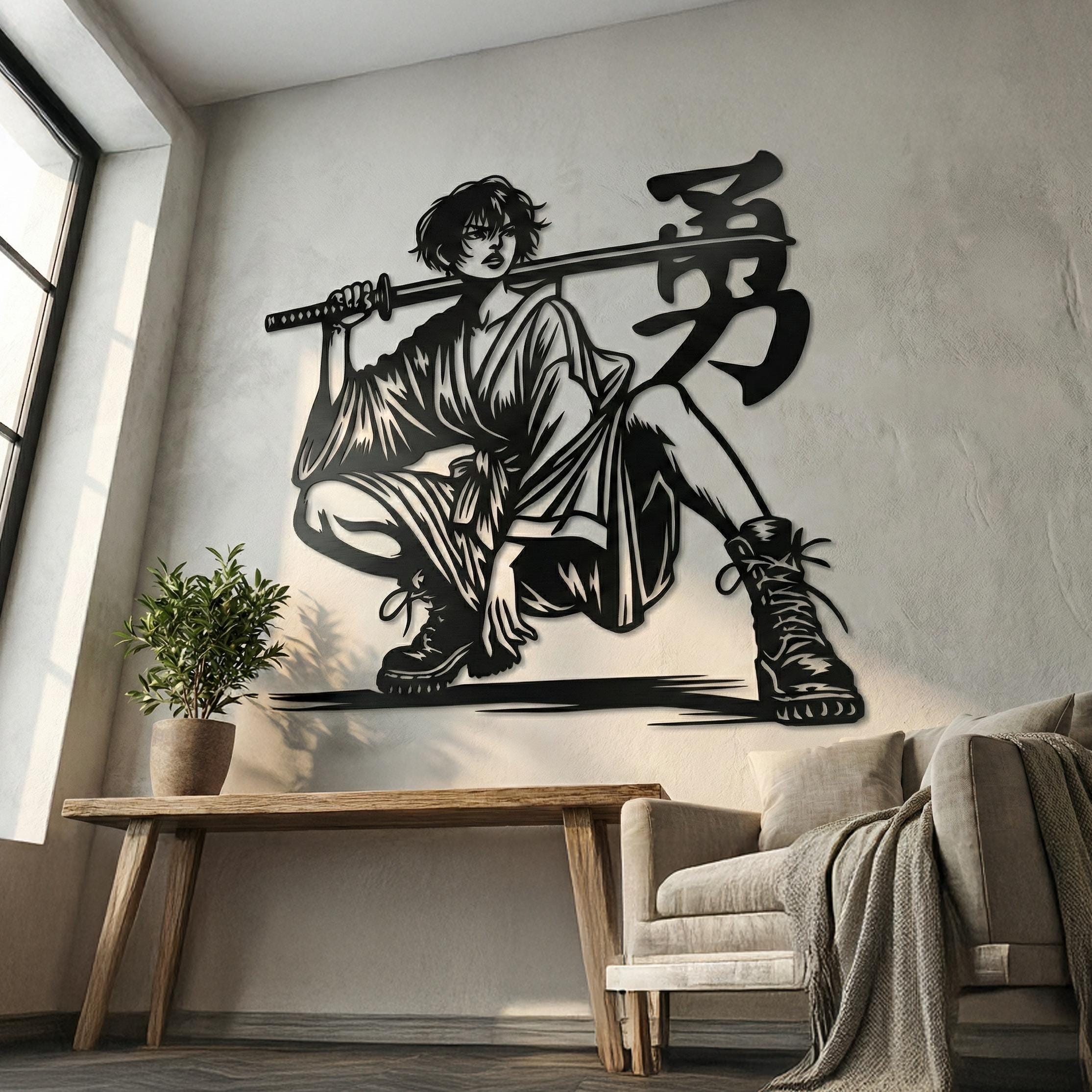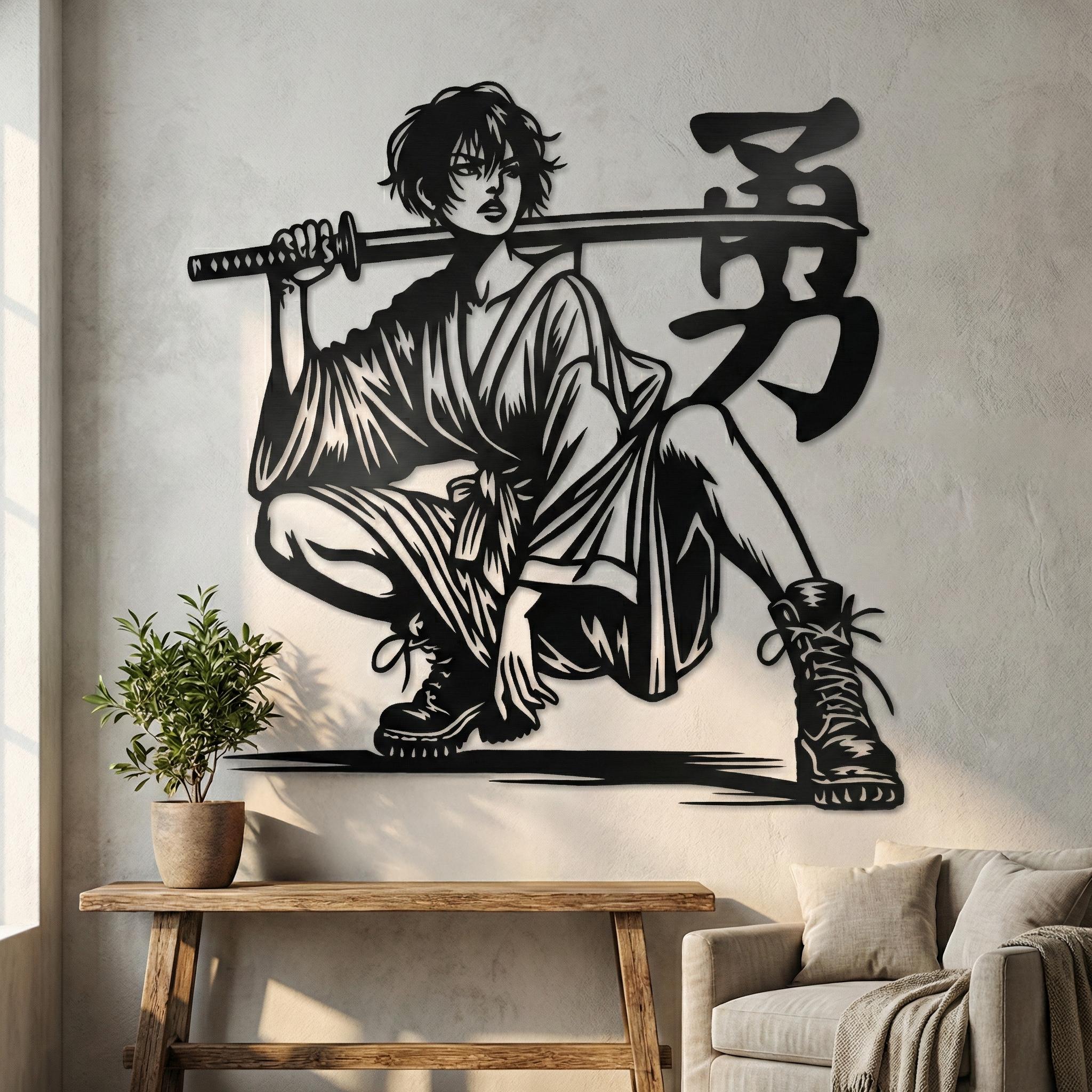 Metal Samurai Warrior Wall Art β Japanese Katana Sword Silhouette, Laser Cut Steel Samurai Decor, Anime Inspired Metal Wall Sculpture