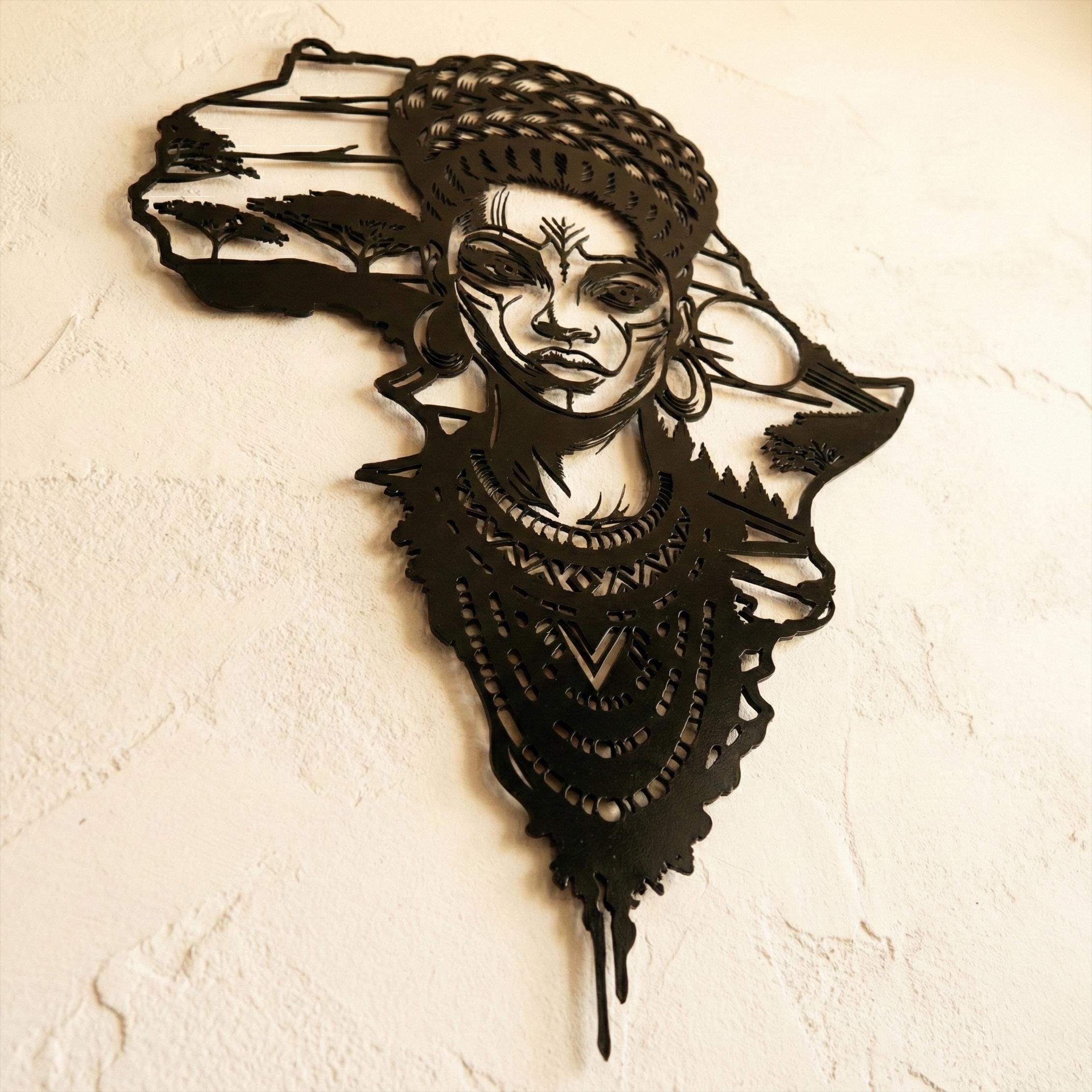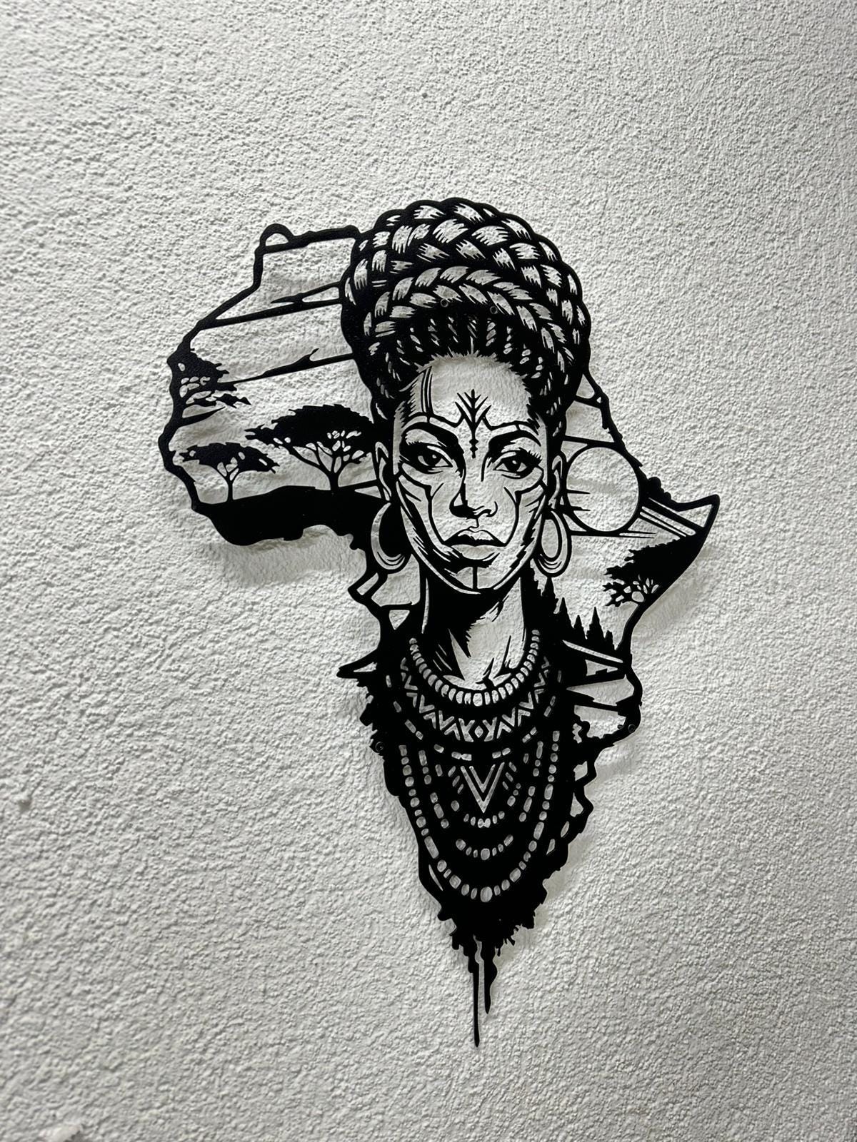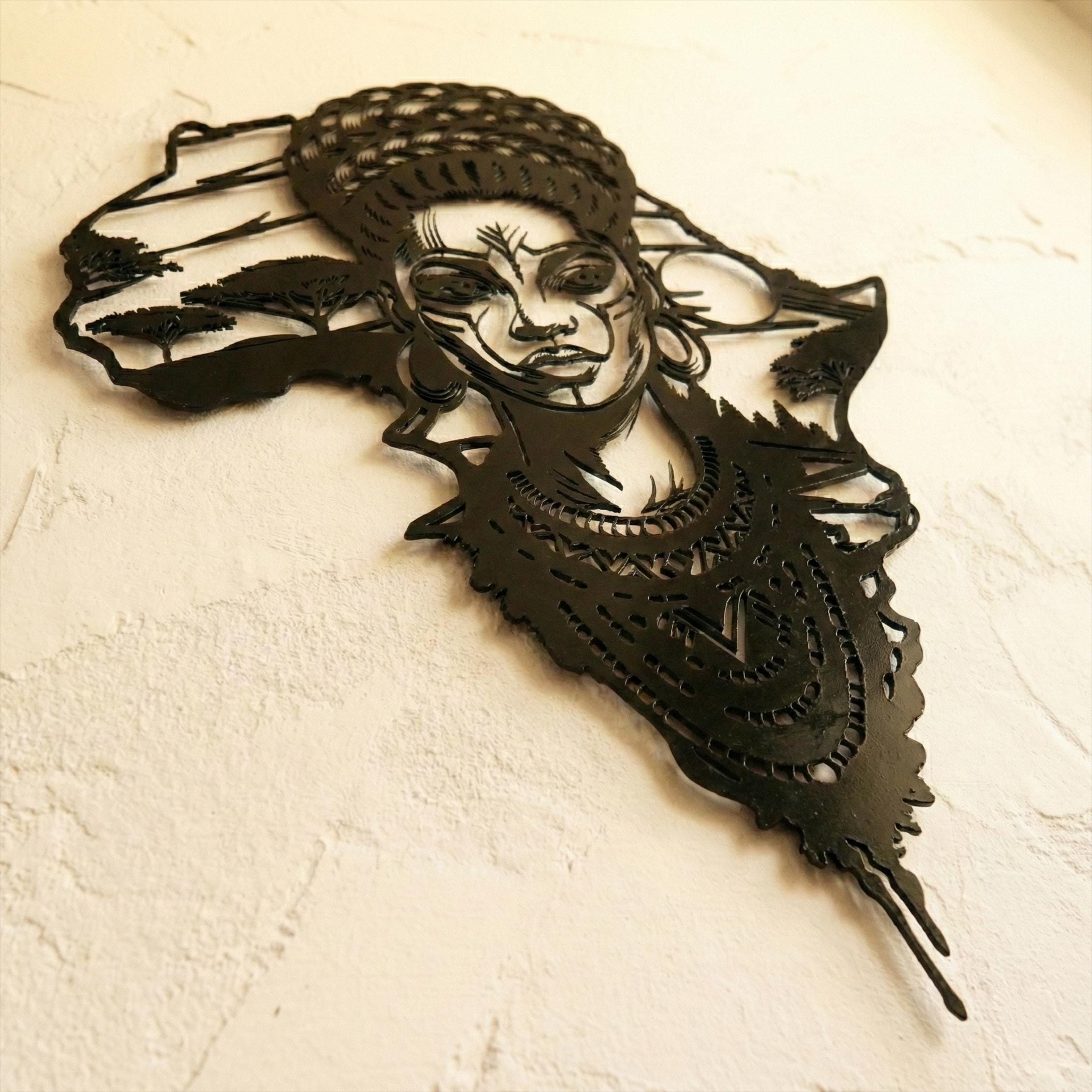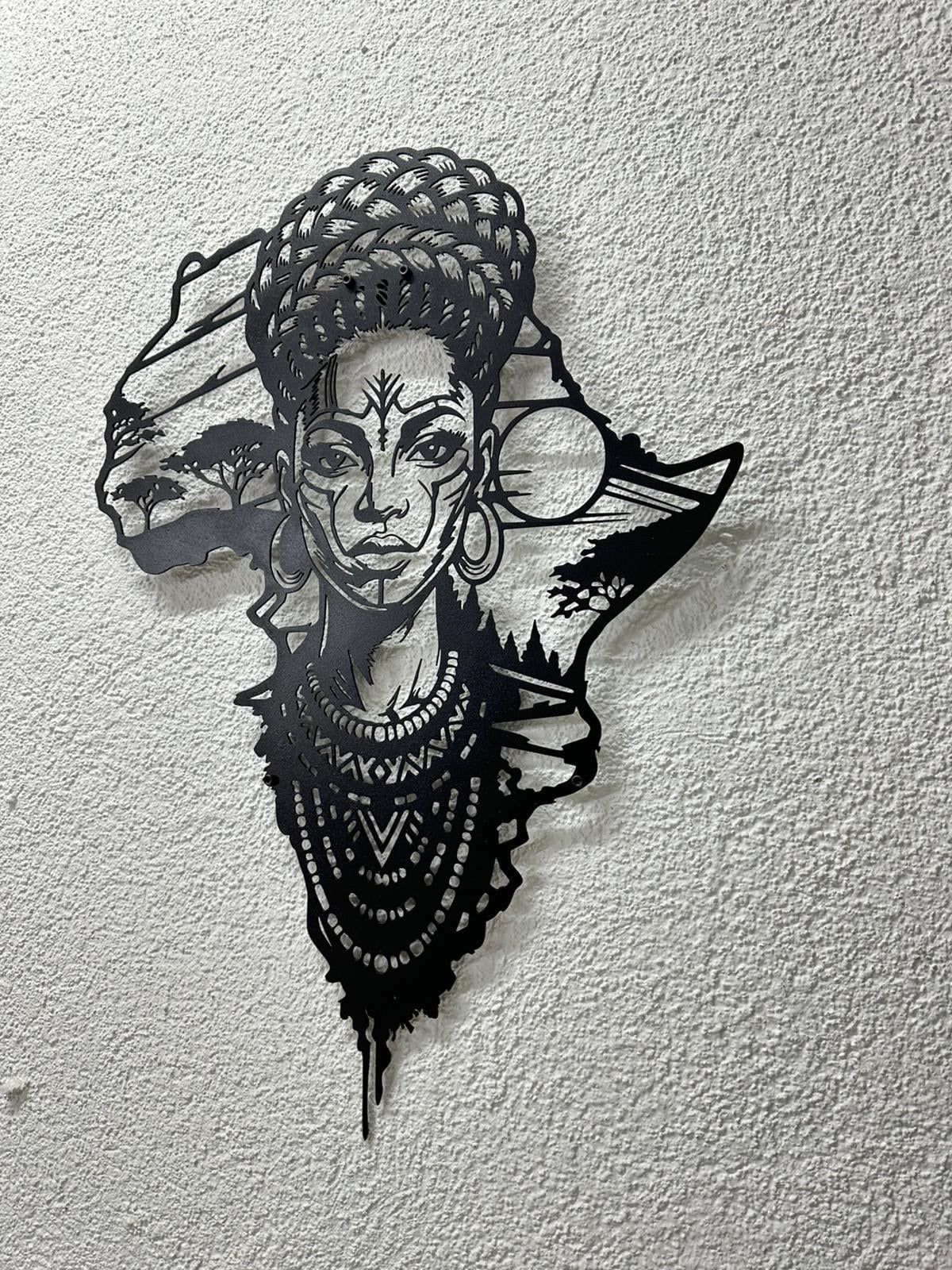 Honor your roots and elevate your home decor with this breathtaking metal wall art. Featuring the outline of the African continent seamlessly blended with the portrait of a regal African woman, this piece is a powerful symbol of beauty, strength, and culture.