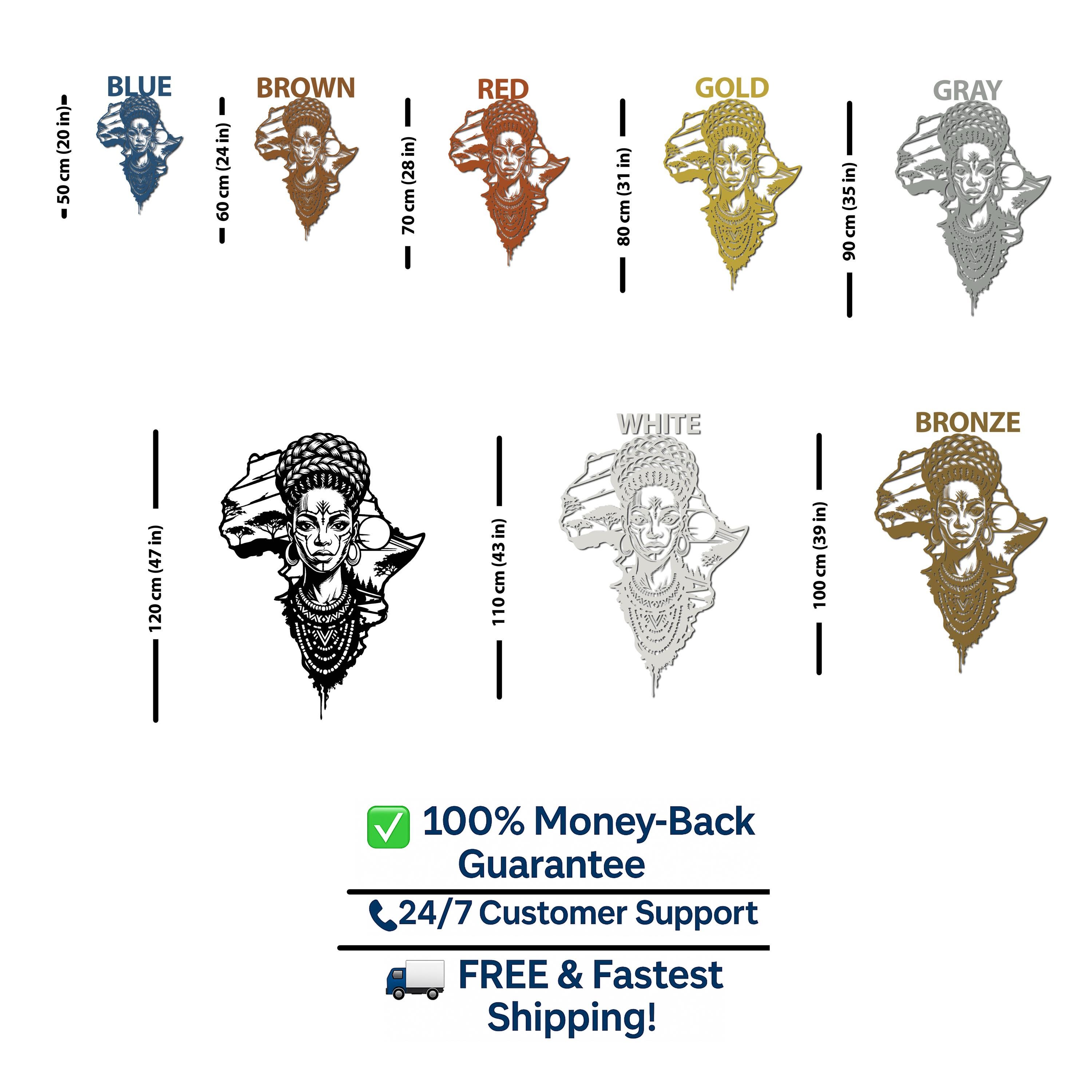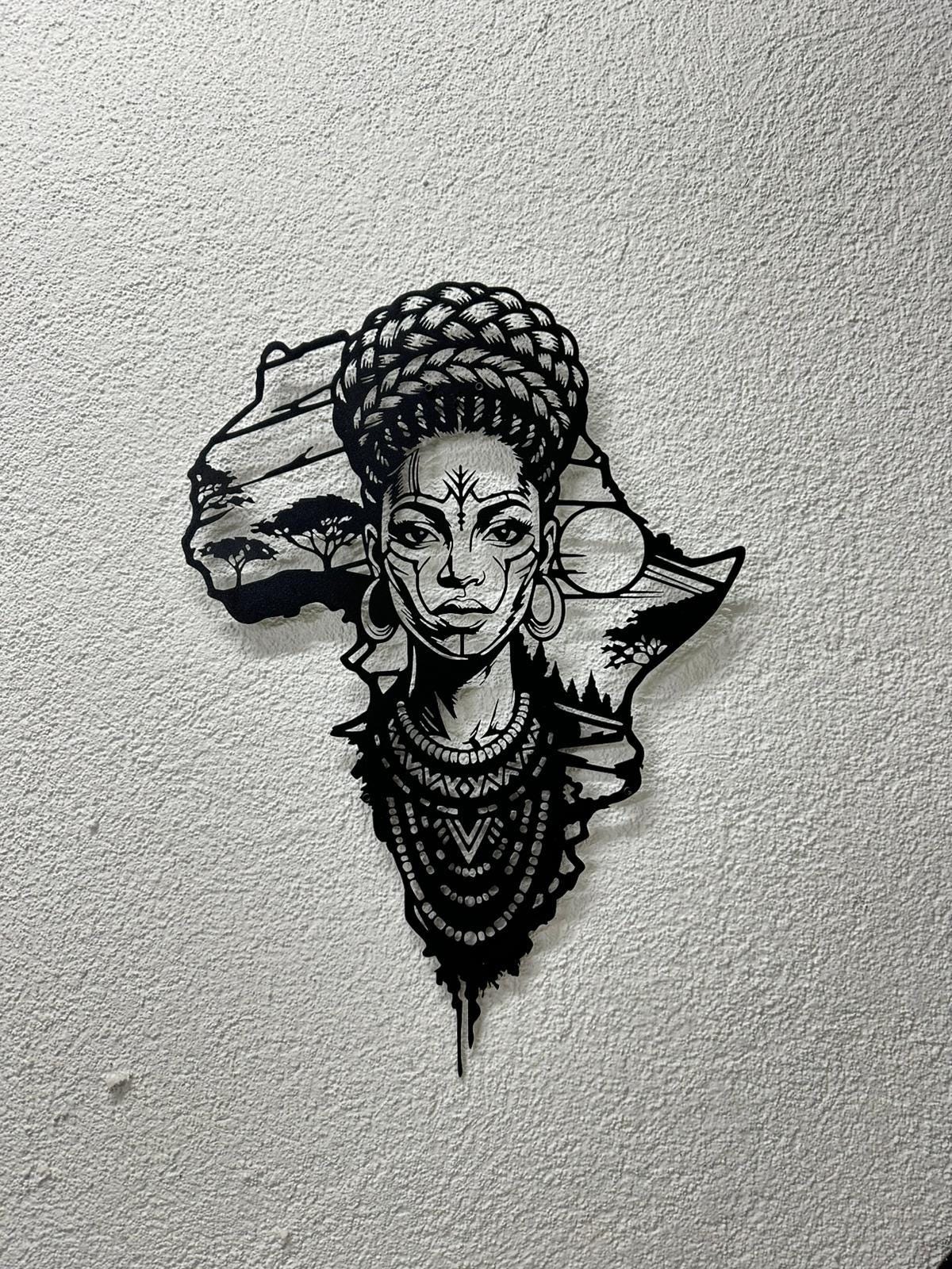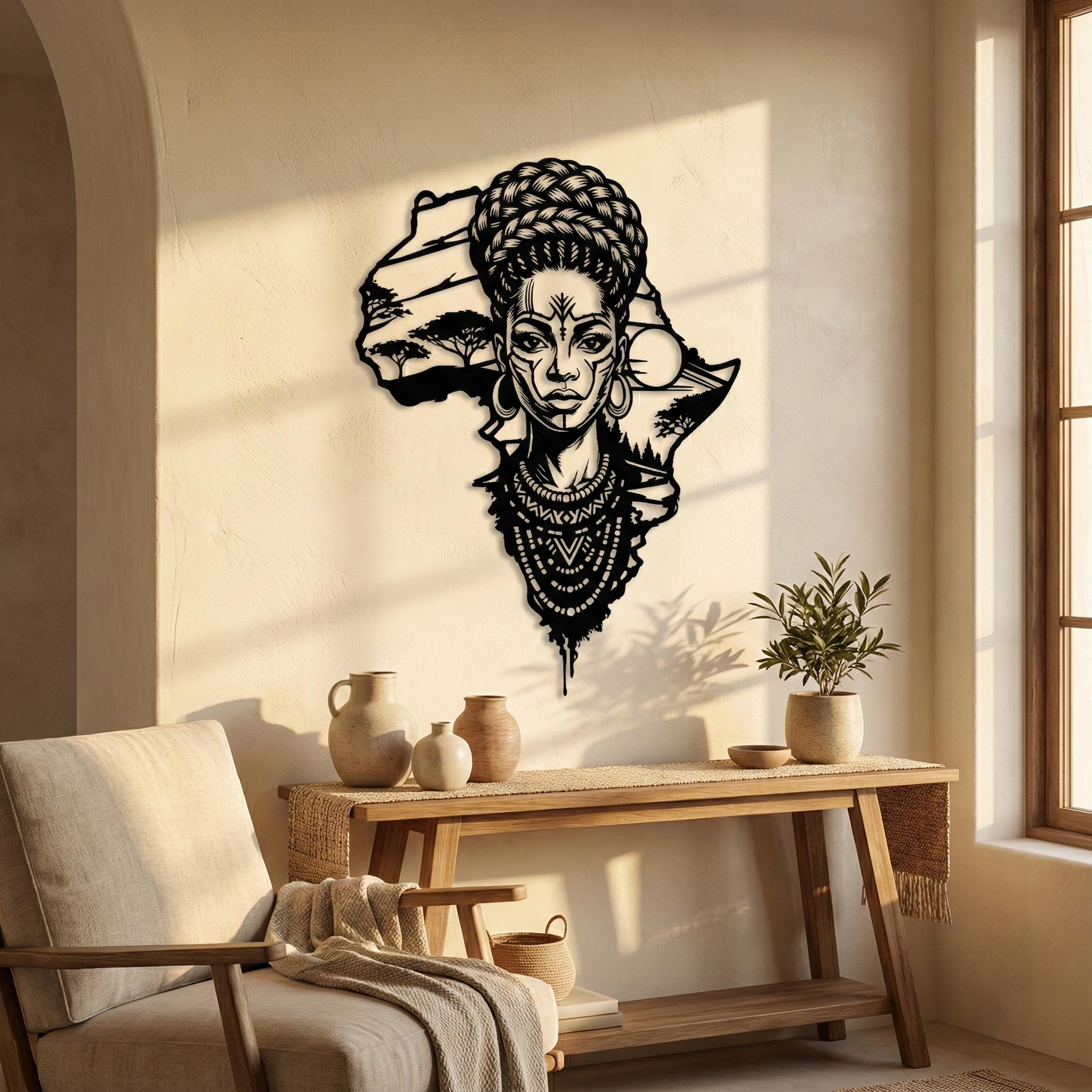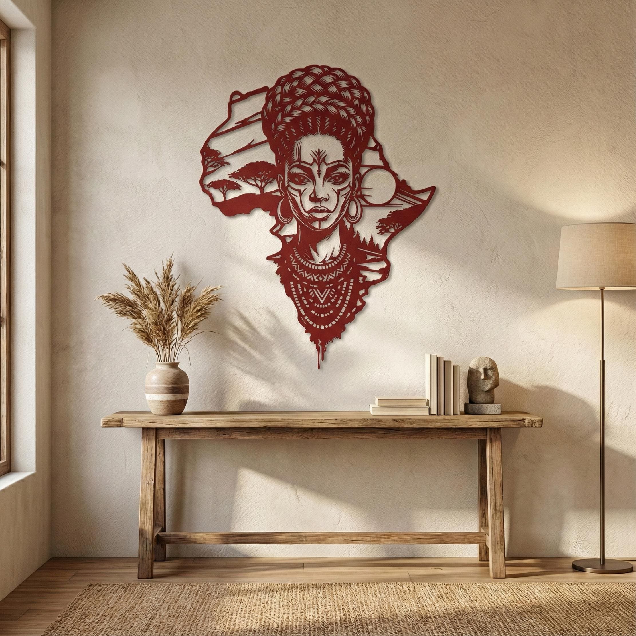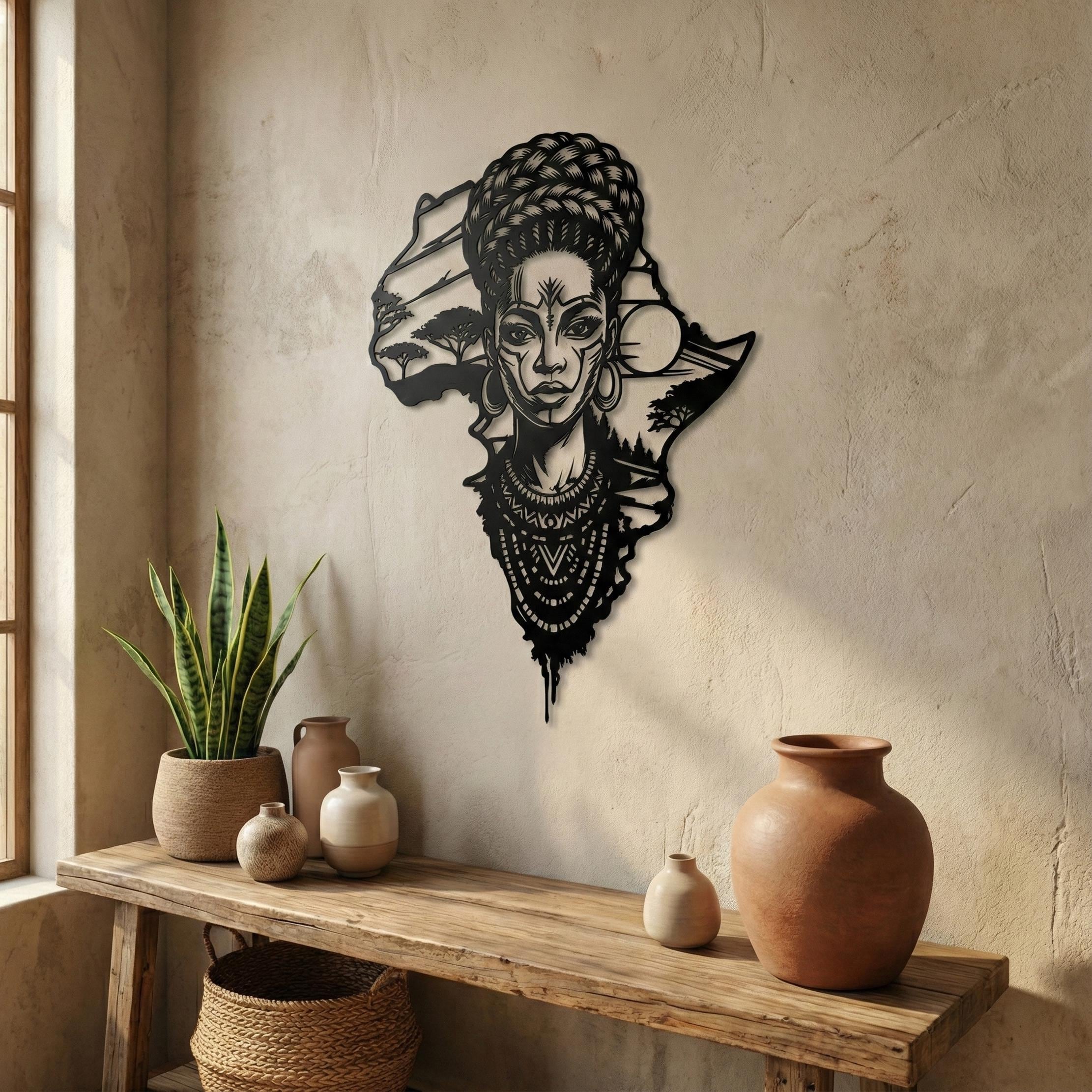 Honor your roots and elevate your home decor with this breathtaking metal wall art. Featuring the outline of the African continent seamlessly blended with the portrait of a regal African woman, this piece is a powerful symbol of beauty, strength, and culture.