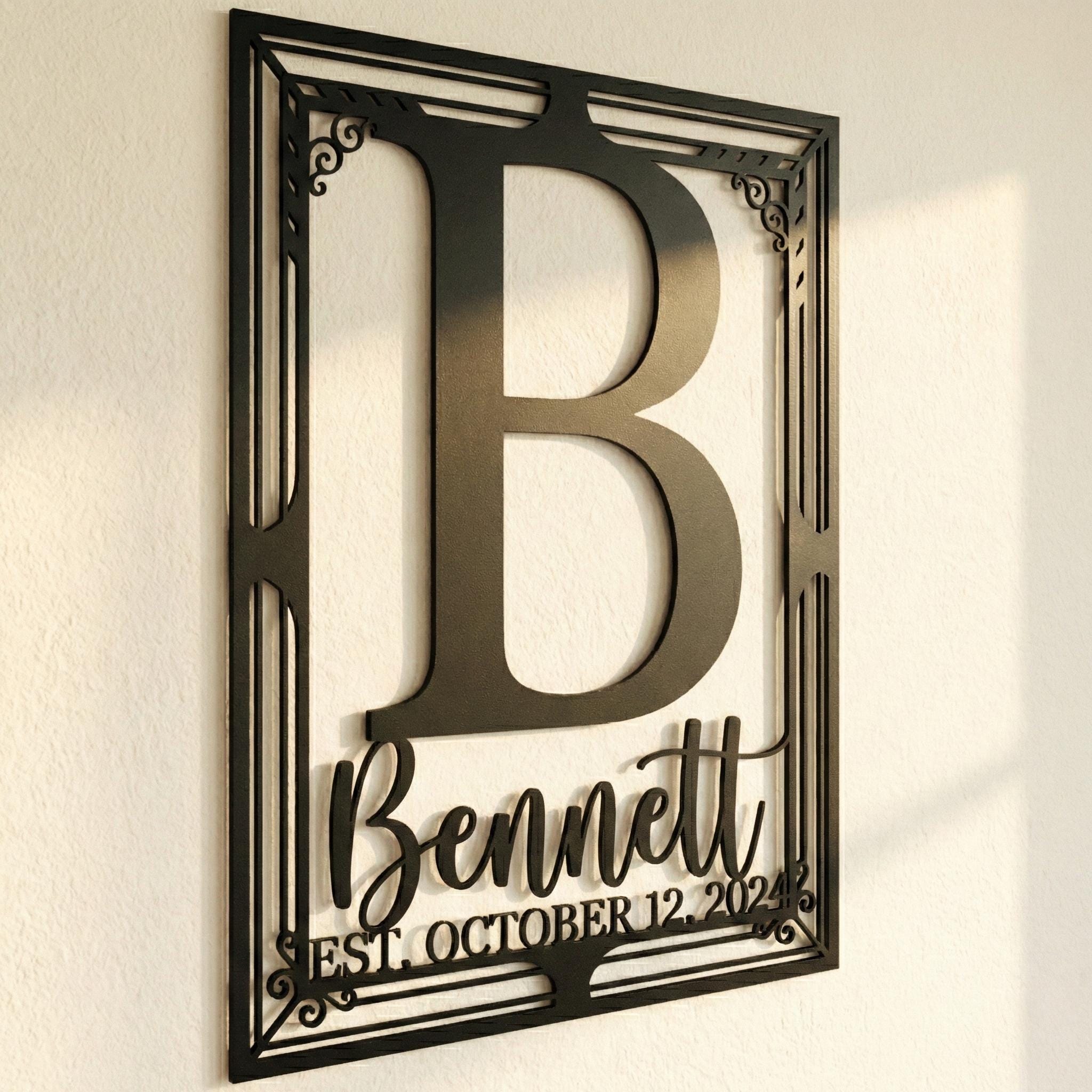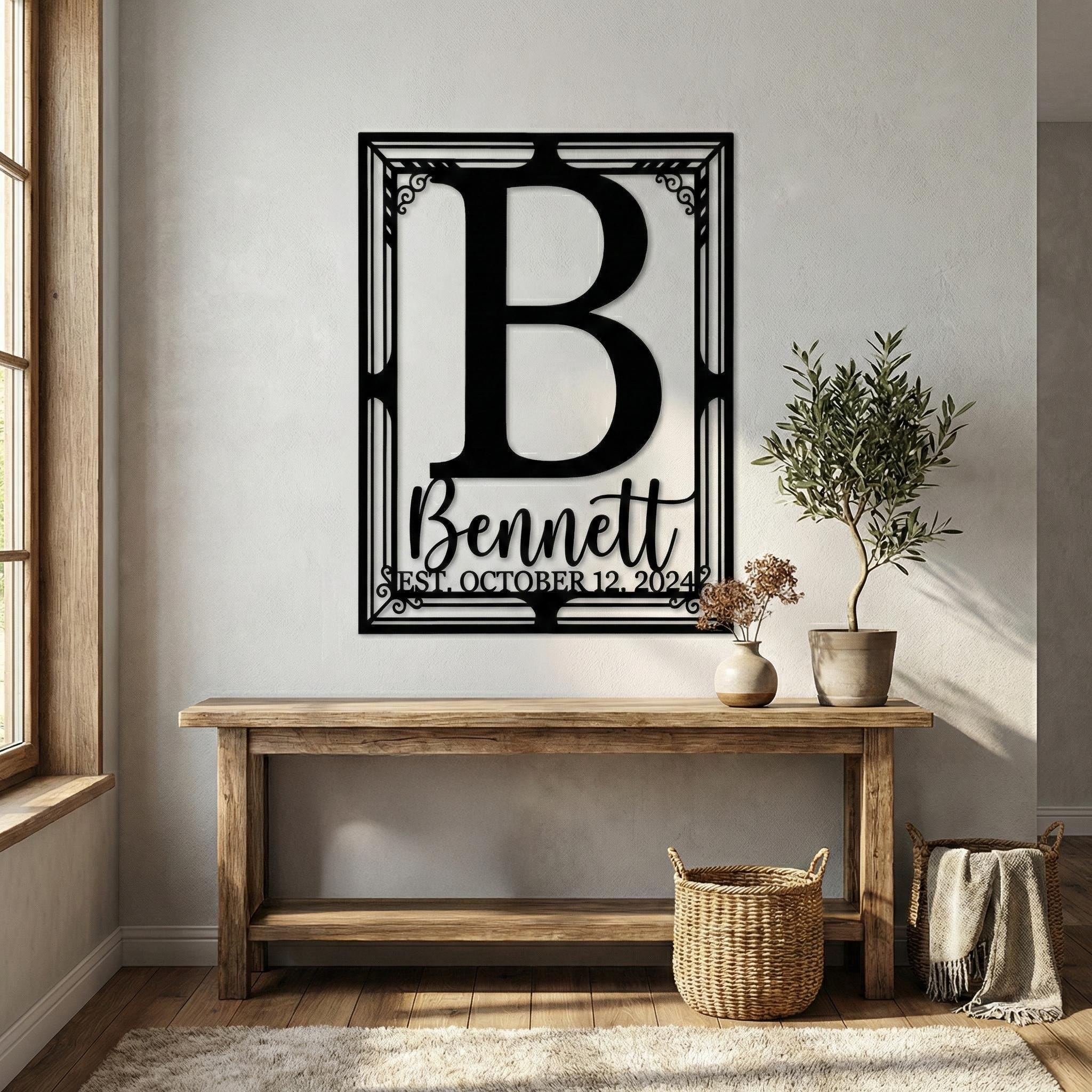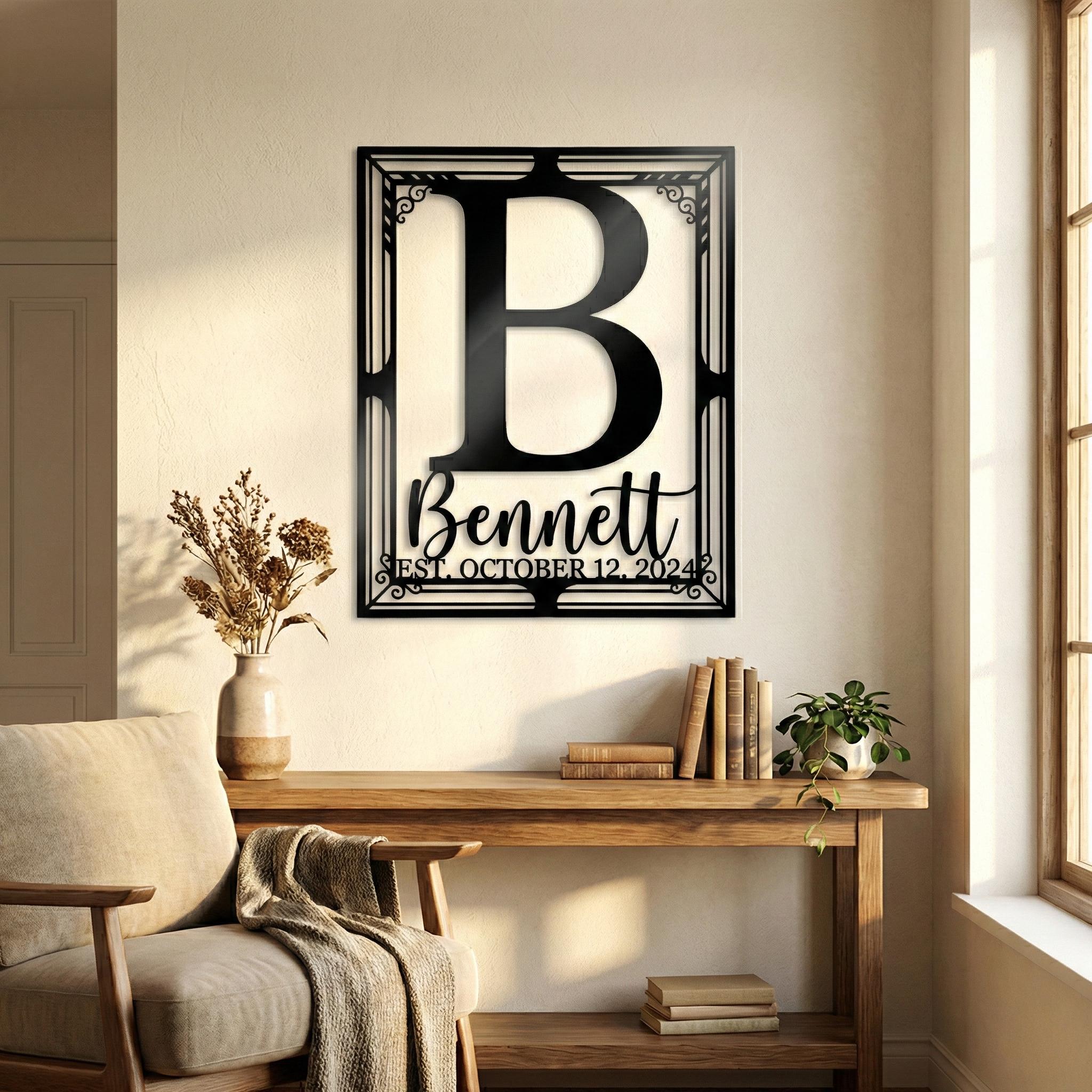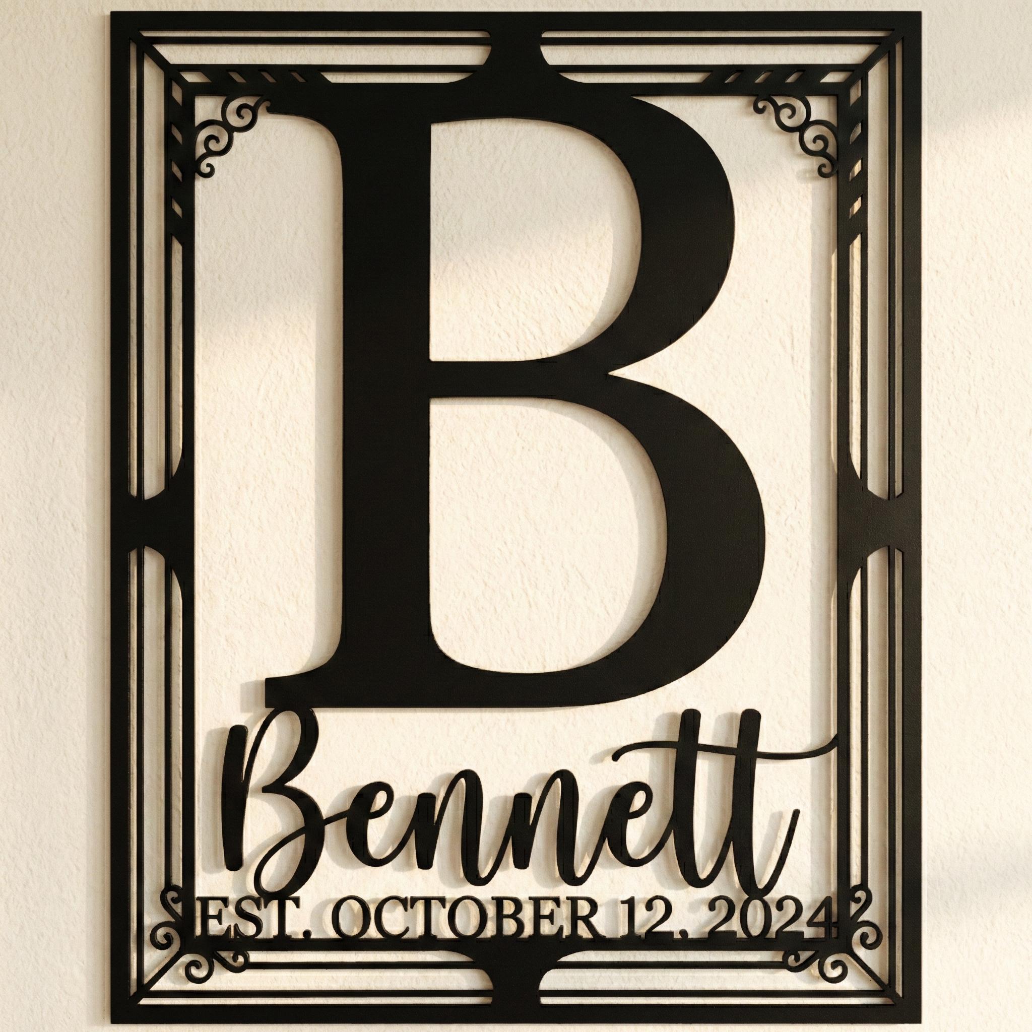 Elevate your home decor with this sophisticated custom wall art. Expertly crafted from high-quality metal for lasting beauty, this sign features a prominent serif monogram initial paired with your family name in an elegant lowercase script and your established date.