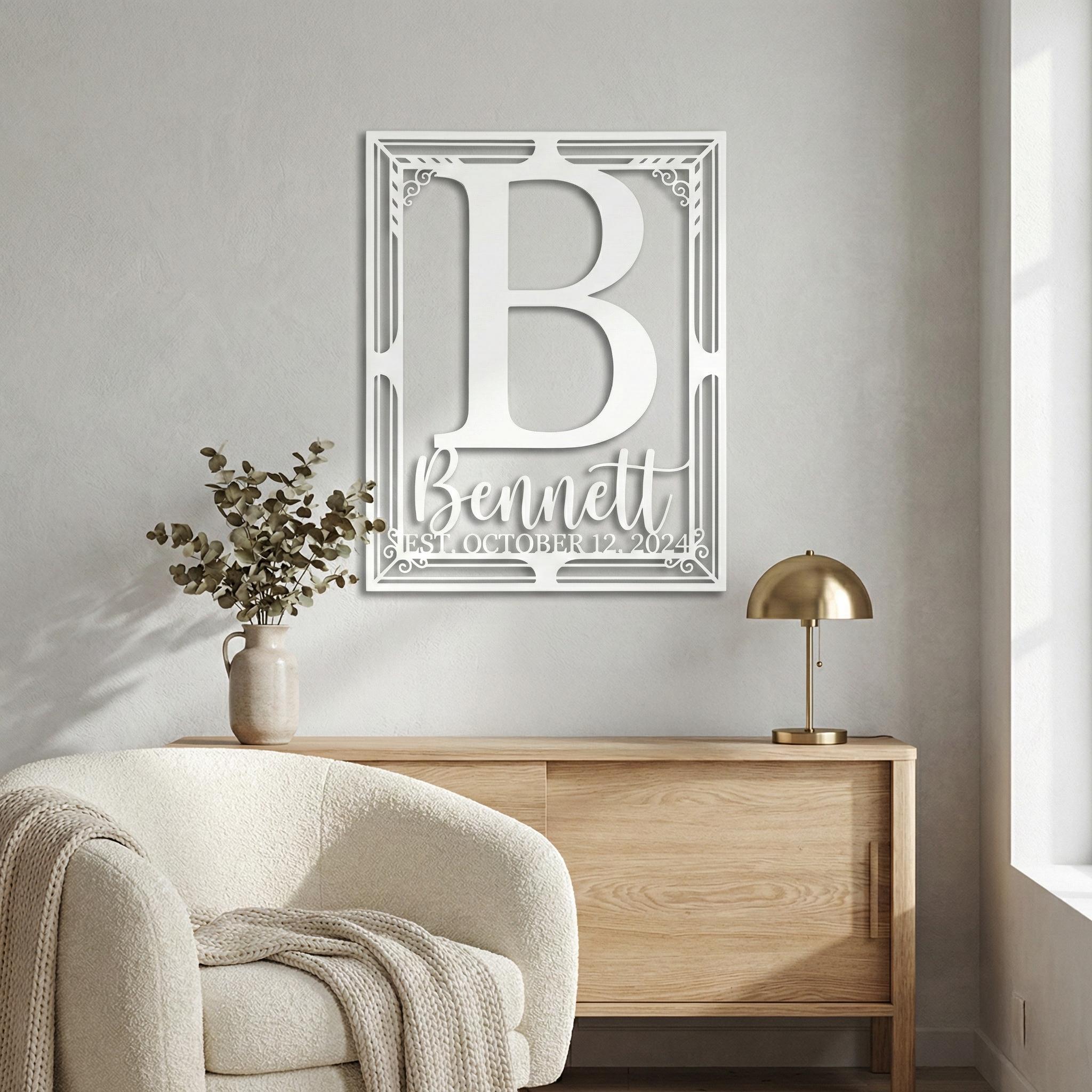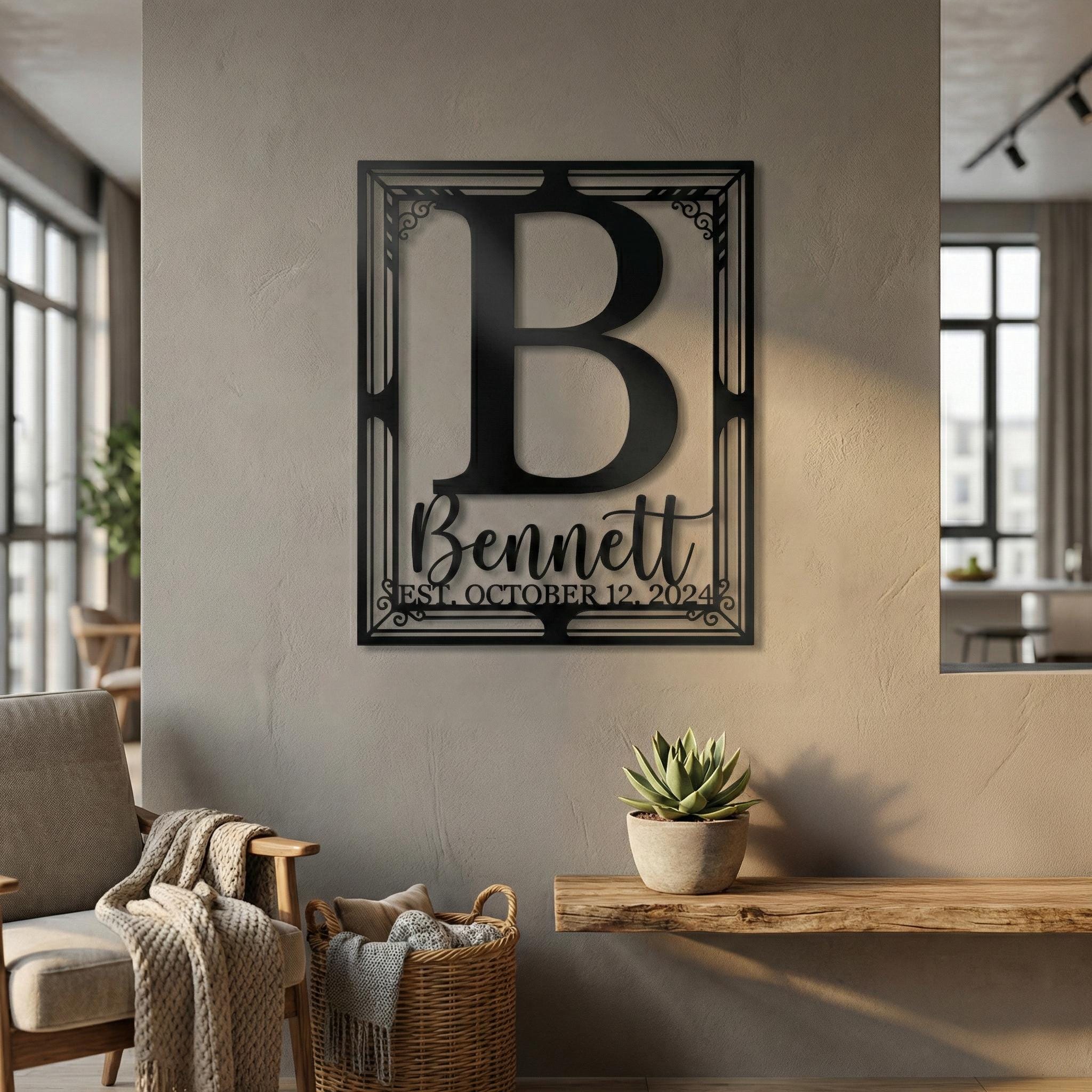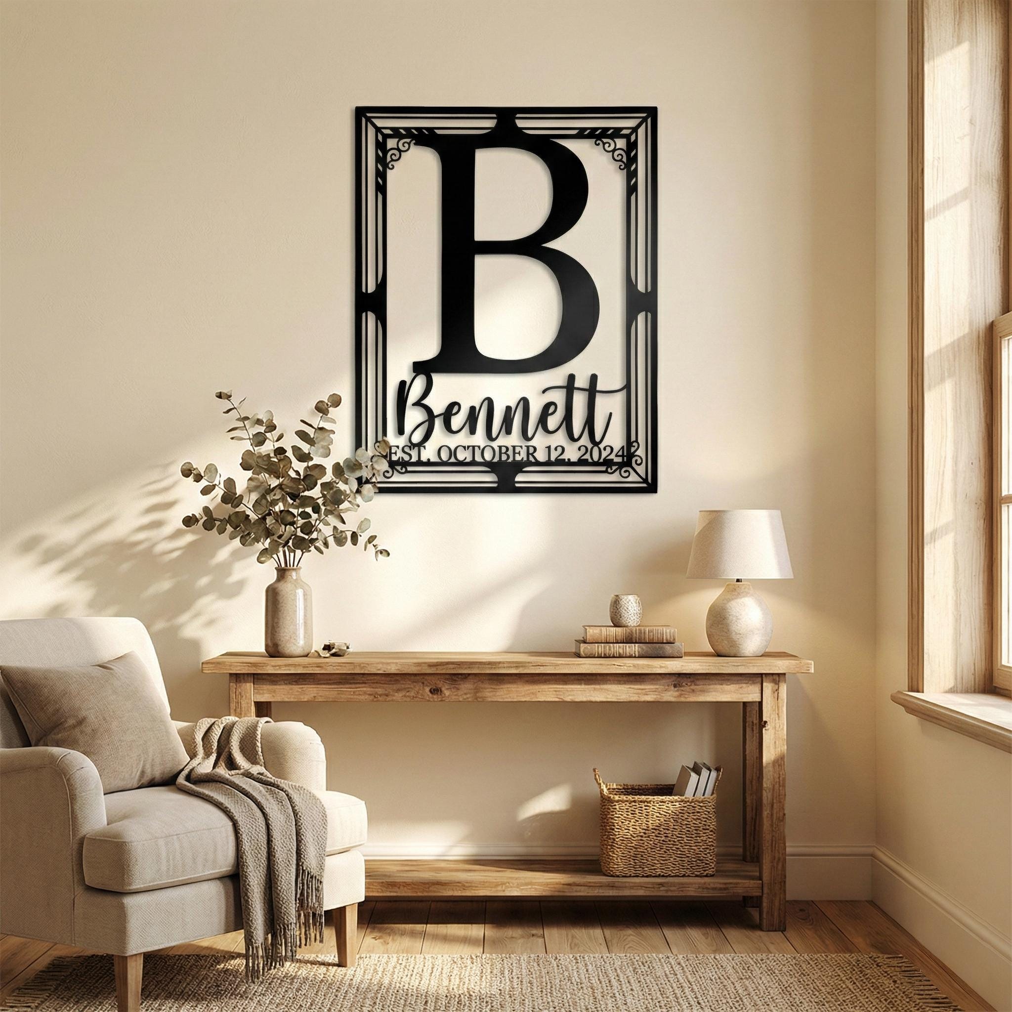 Elevate your home decor with this sophisticated custom wall art. Expertly crafted from high-quality metal for lasting beauty, this sign features a prominent serif monogram initial paired with your family name in an elegant lowercase script and your established date.
