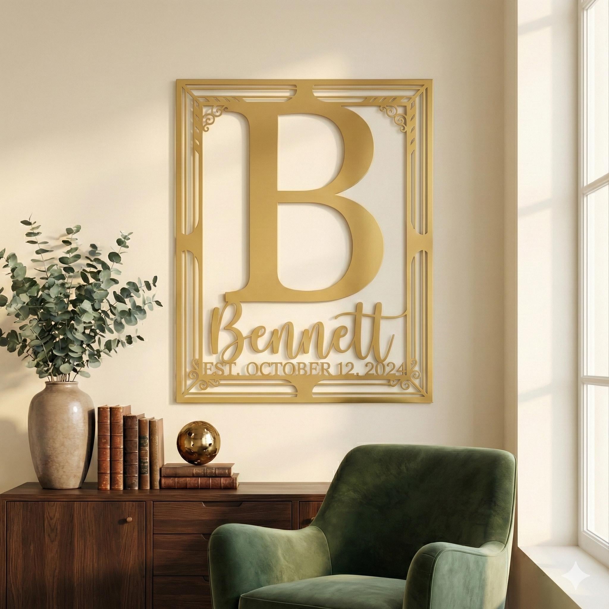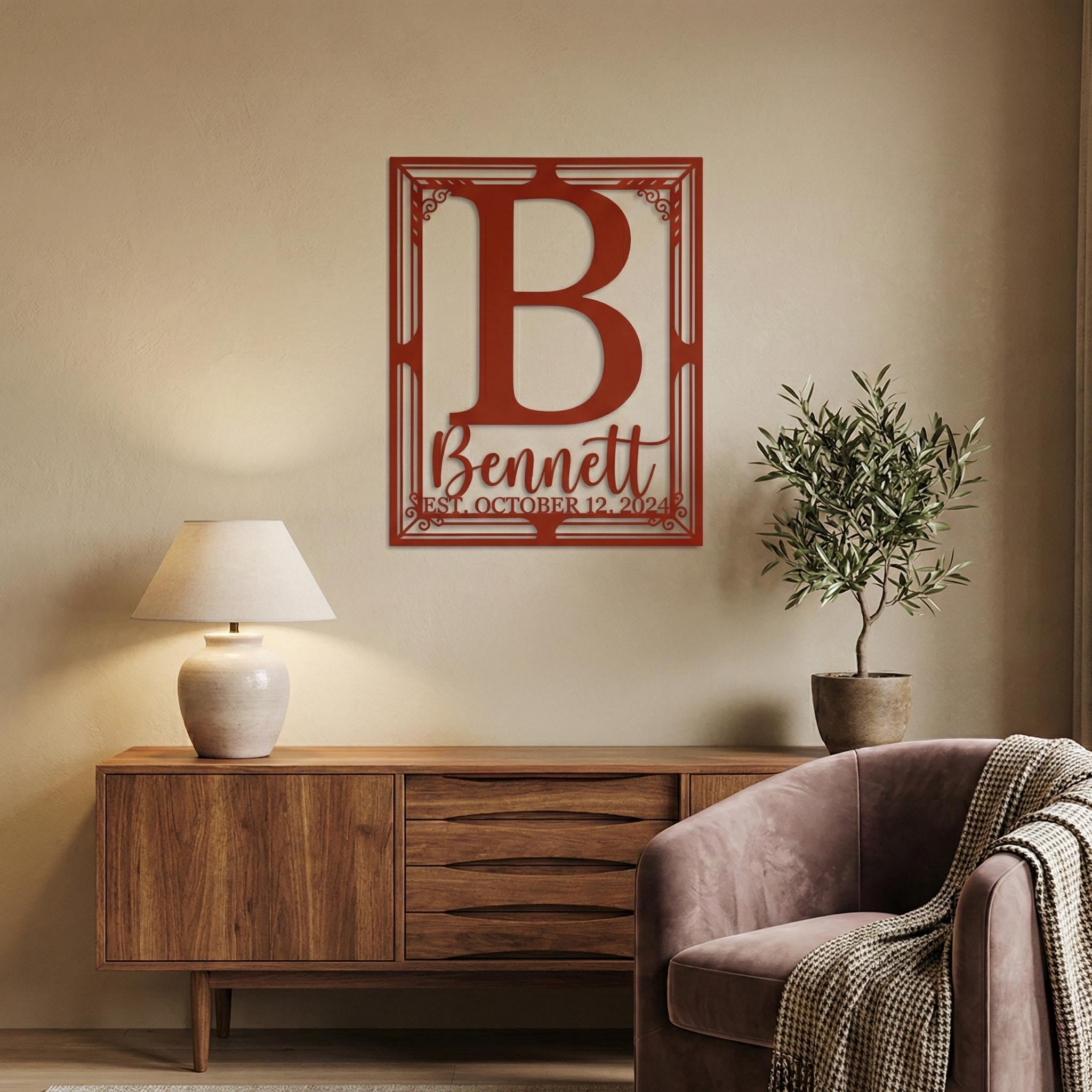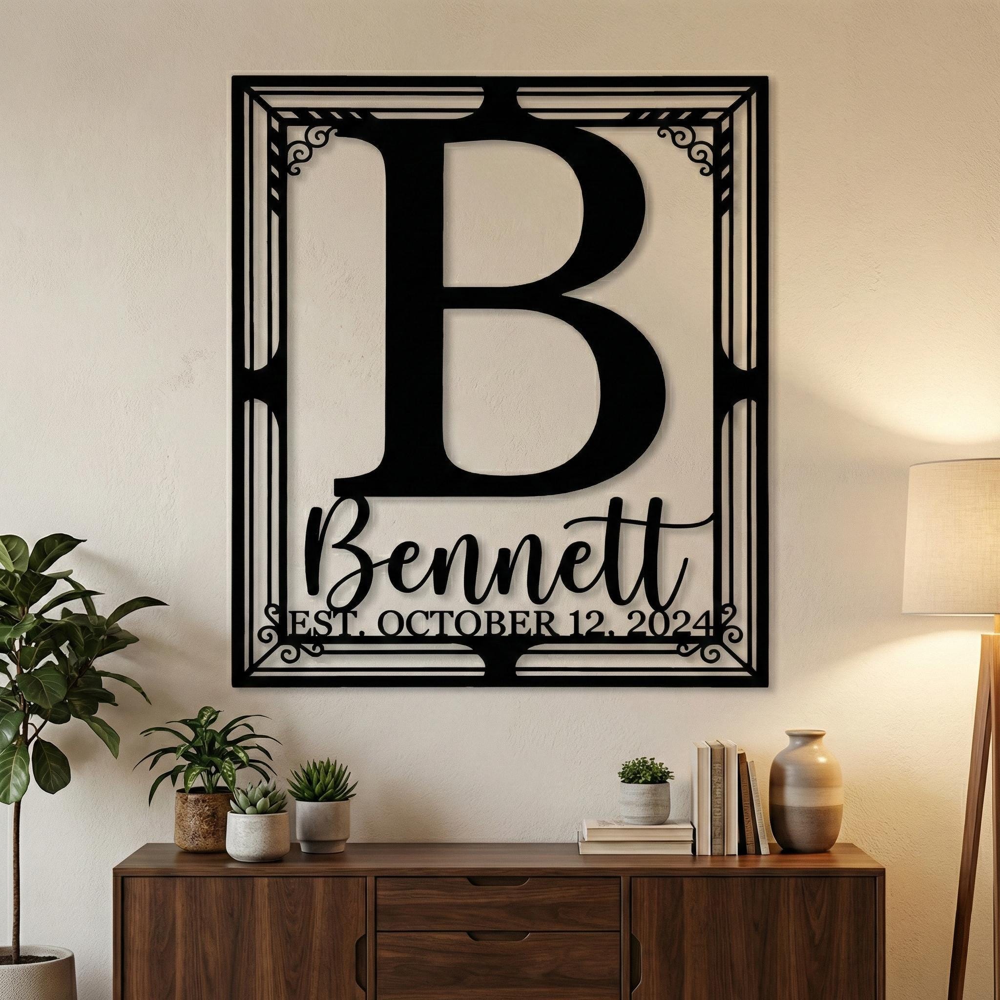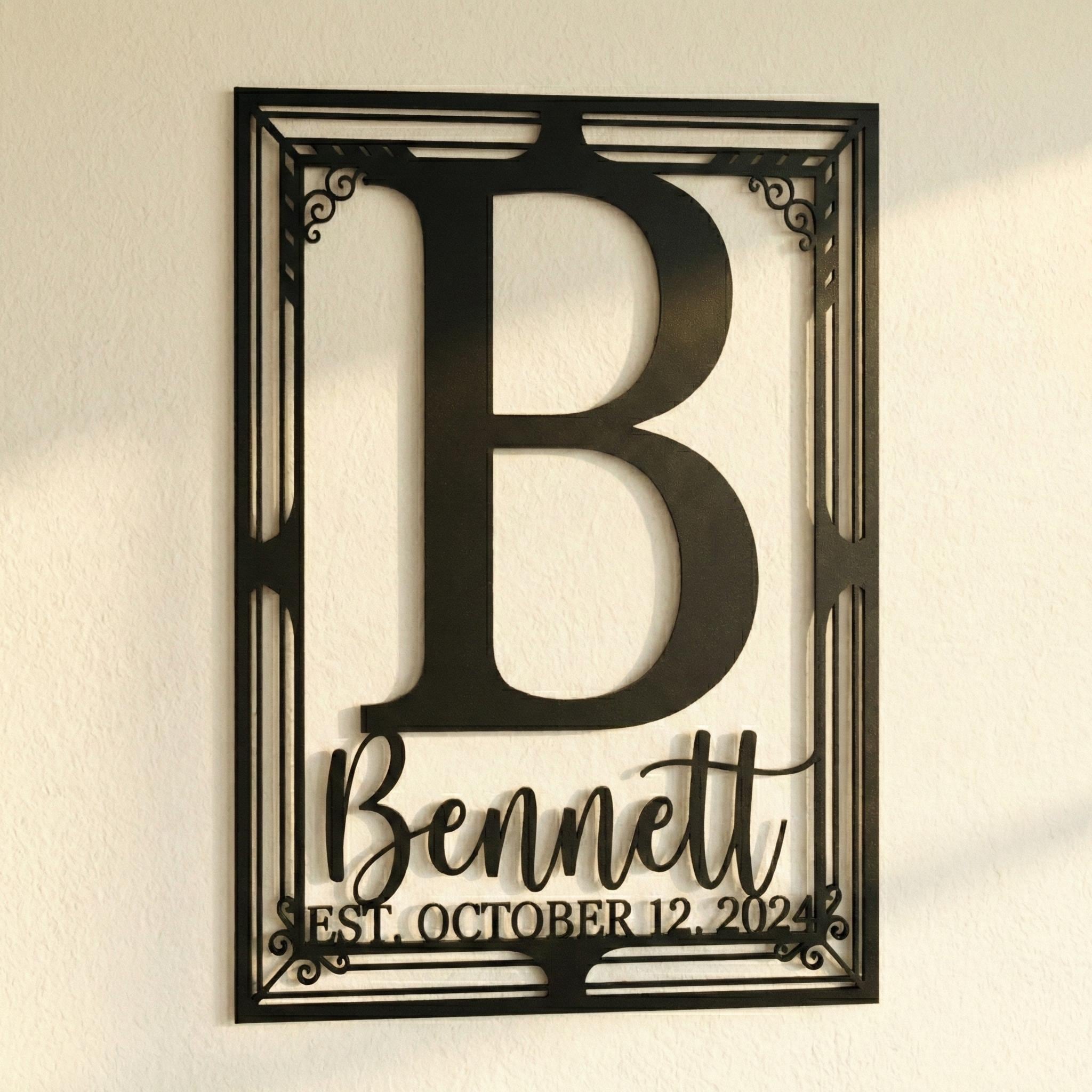 Elevate your home decor with this sophisticated custom wall art. Expertly crafted from high-quality metal for lasting beauty, this sign features a prominent serif monogram initial paired with your family name in an elegant lowercase script and your established date.